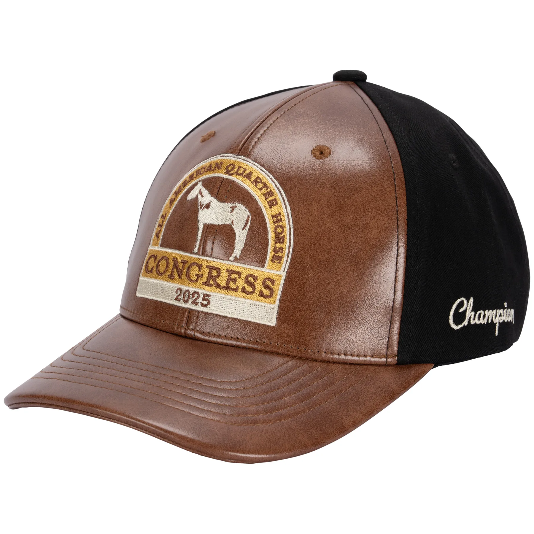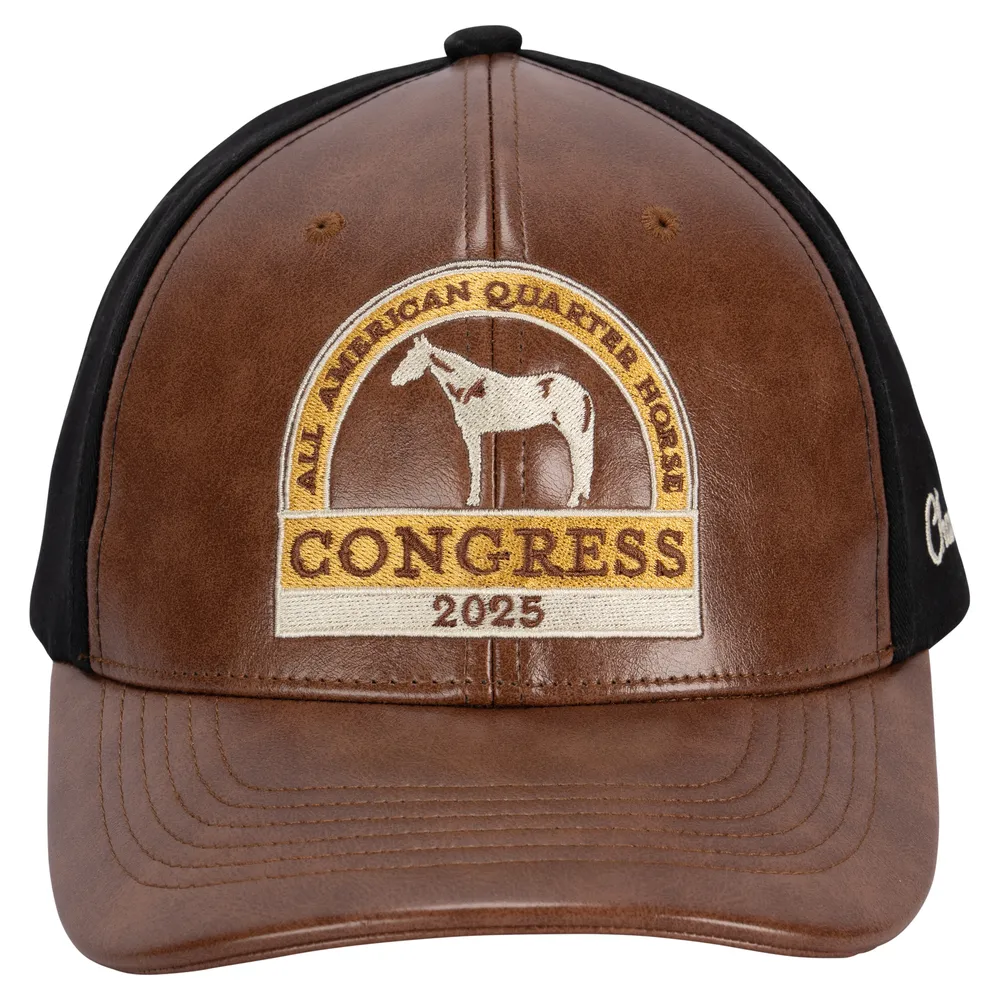 Top off your Congress look with the 2025 Congress Ball Cap a stylish, commemorative accessory designed to match this year's iconic jackets. Featuring a faux leather front in rugged 'crazy horse' styling, this cap adds a bold finish to any outfit. The black sides and rear with adjustable Velcro strap ensure a secure, low-profile fit that flatters both men and women. Perfect for show days, barn days, or everyday wear, it's a must-have piece of official Congress gear.