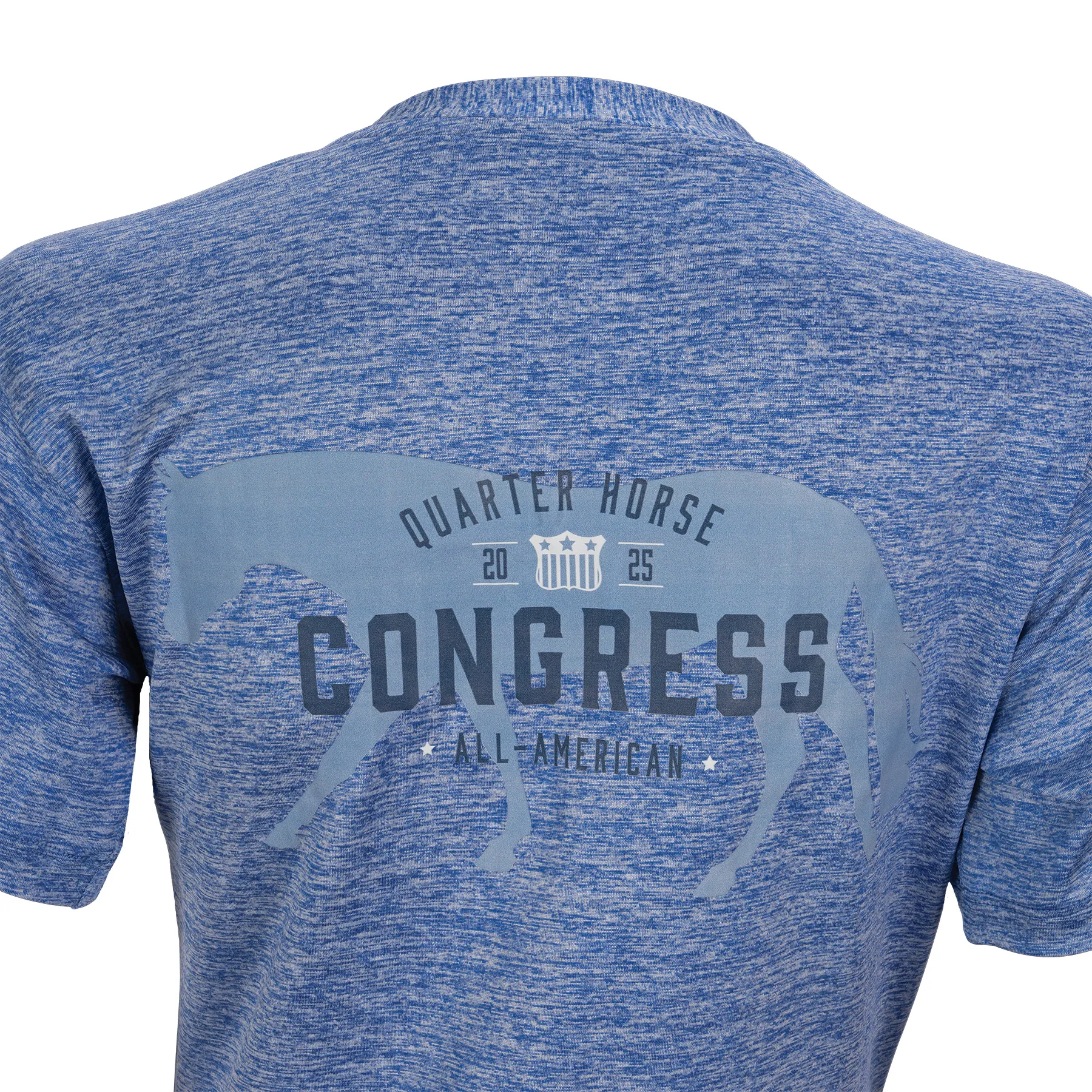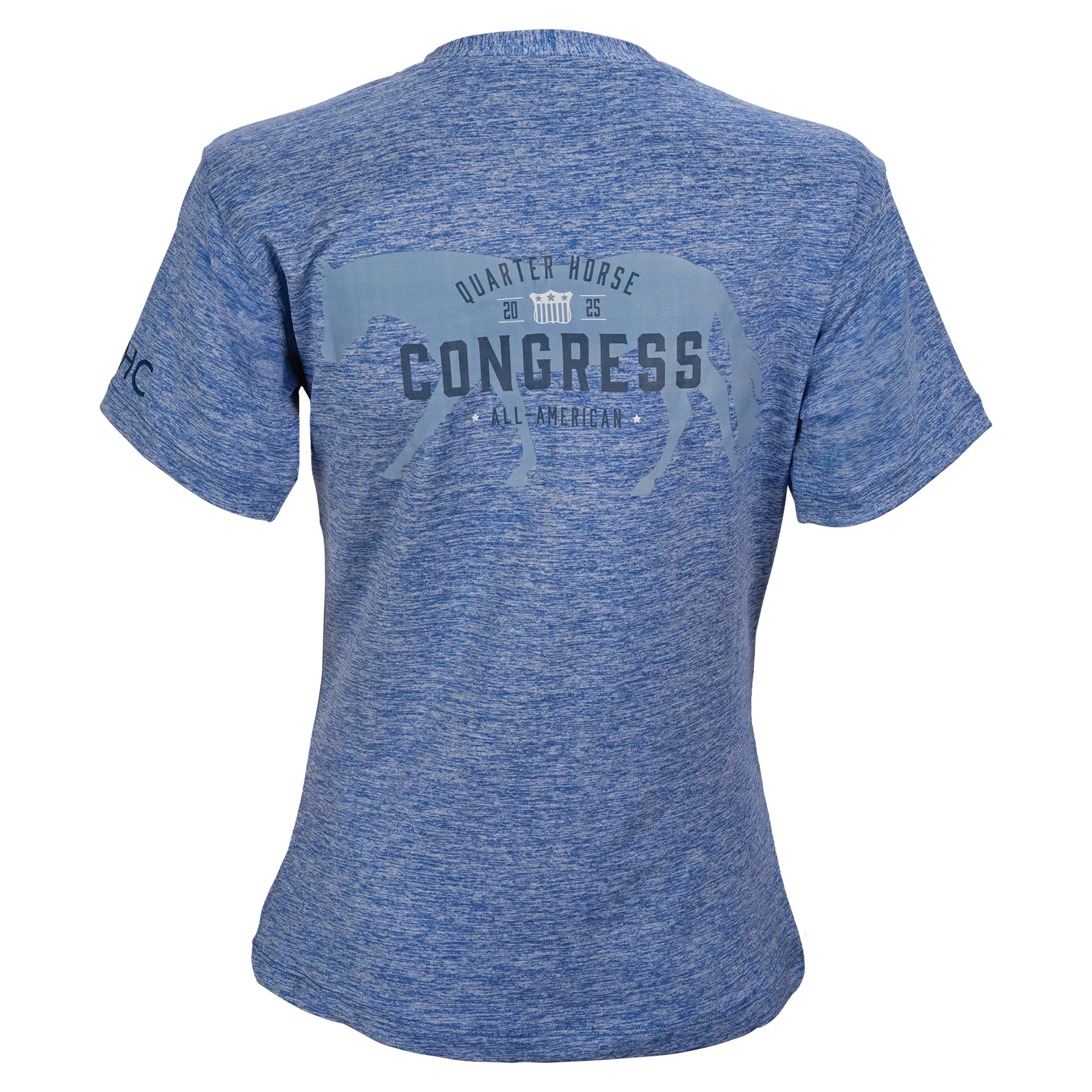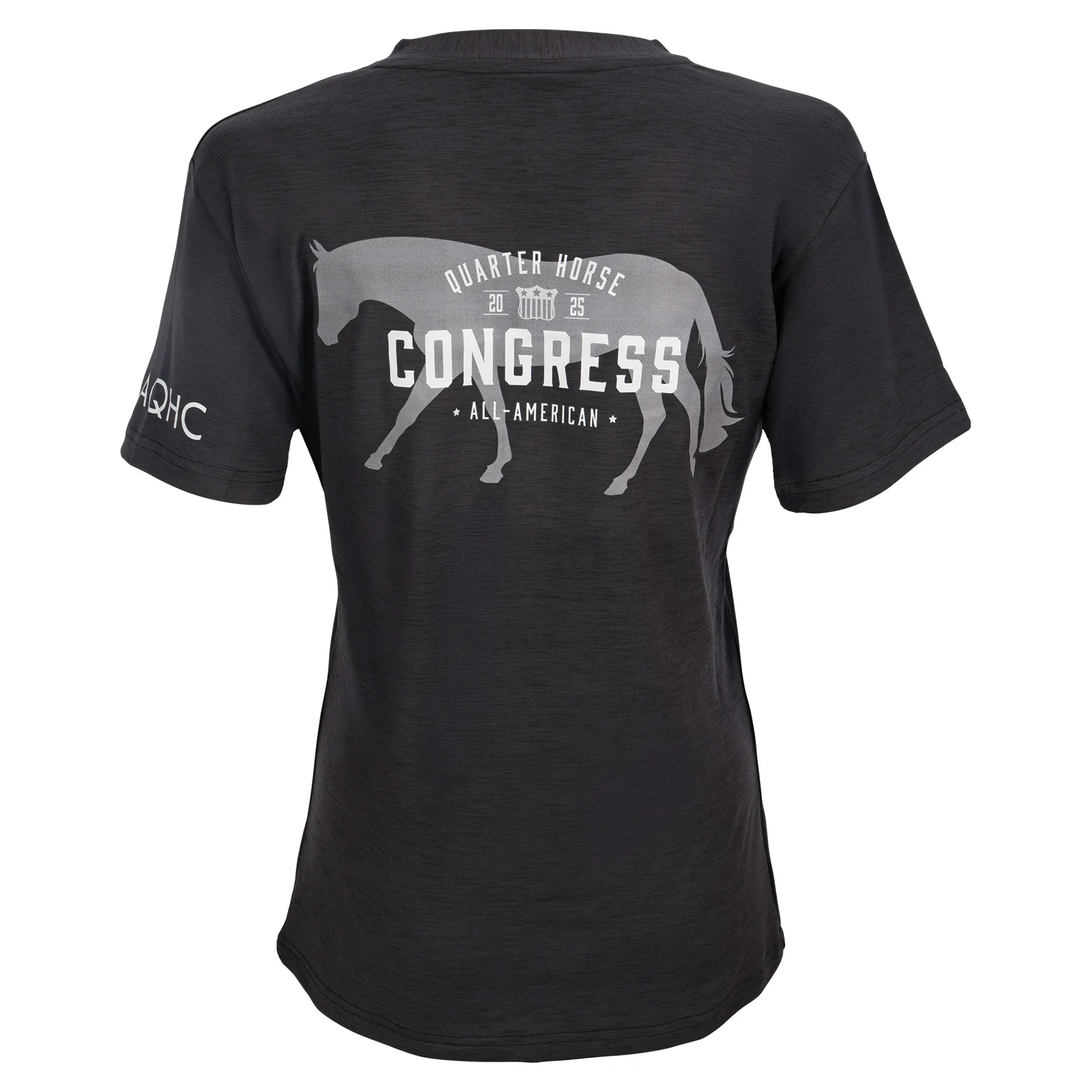Stay cool, confident, and Congress-ready in the 2025 Ladies V-Neck Performance Shirt. Designed with a flattering feminine fit and made from breathable heathered performance Lycra, this shirt keeps you comfortable whether you're riding, running errands, or relaxing ringside. A tonal pleasure horse graphic on the back adds subtle equestrian style, while the sleeve hem text logo completes the look with a polished finish.