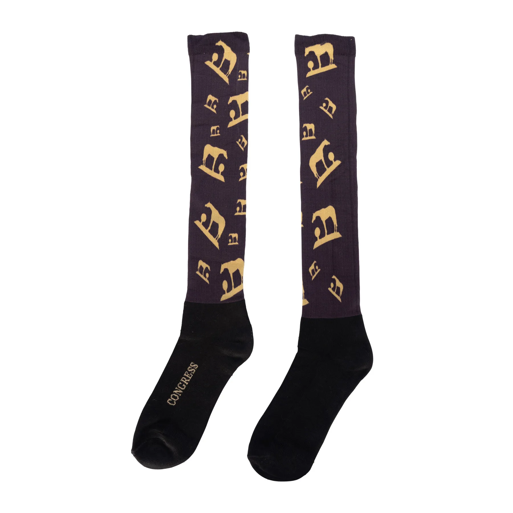 Slide into the saddle with style and comfort in the 2025 Congress Nylon Printed Tall Sock. Designed specifically for riders, these knee-high socks are breathable, lightweight, and cushioned where it counts. The vibrant Congress-themed print featuring gold trophy horses and red, white, and blue shields adds a bold dash of show pride to your riding gear.