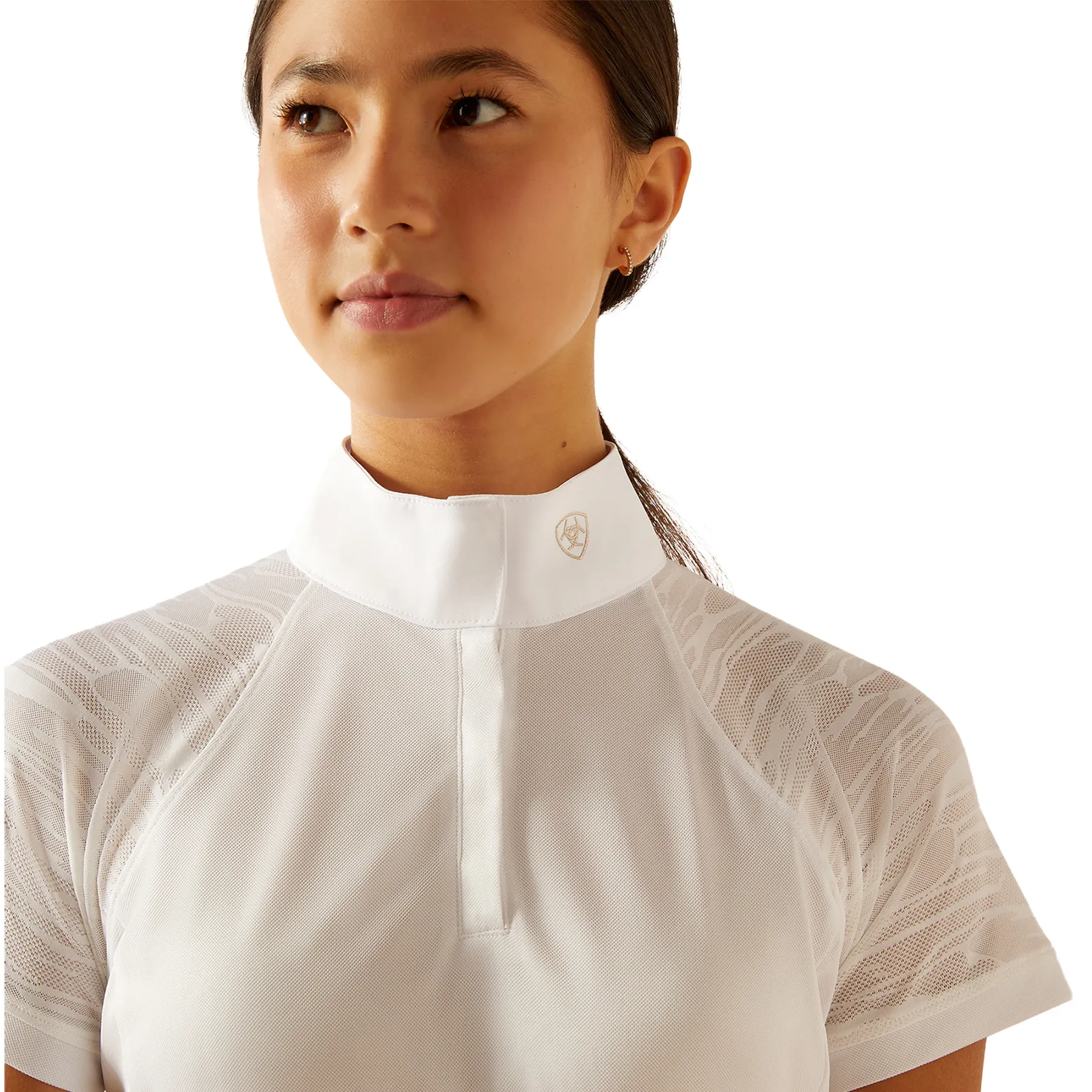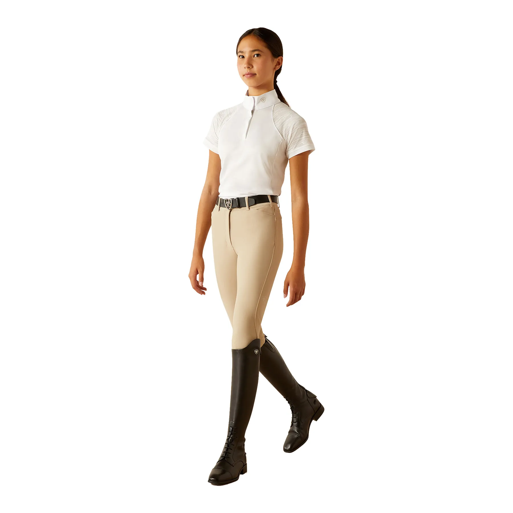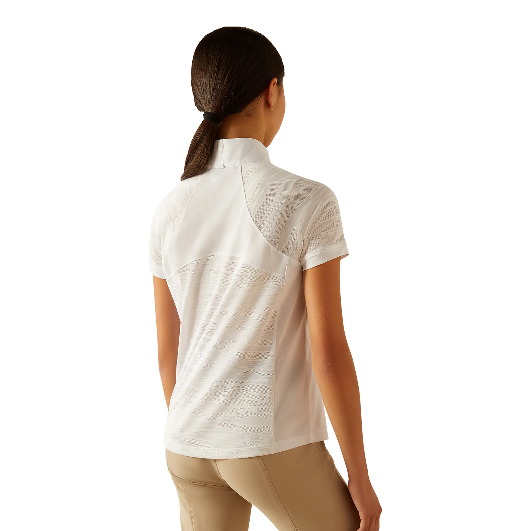 Let your young rider shine in the ring with this lightweight, performance-driven show shirt. Designed for summer competitions, it features striking tiger-stripe mesh panels for ultimate breathability and style. Whether they're show jumping, eventing, or mastering dressage, this shirt keeps them cool, confident, and competition-ready.