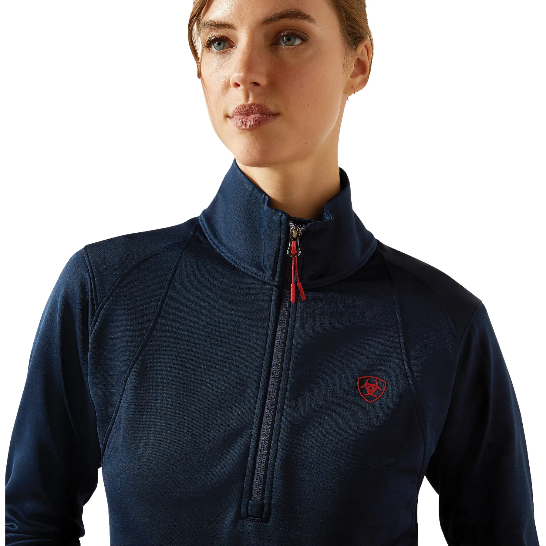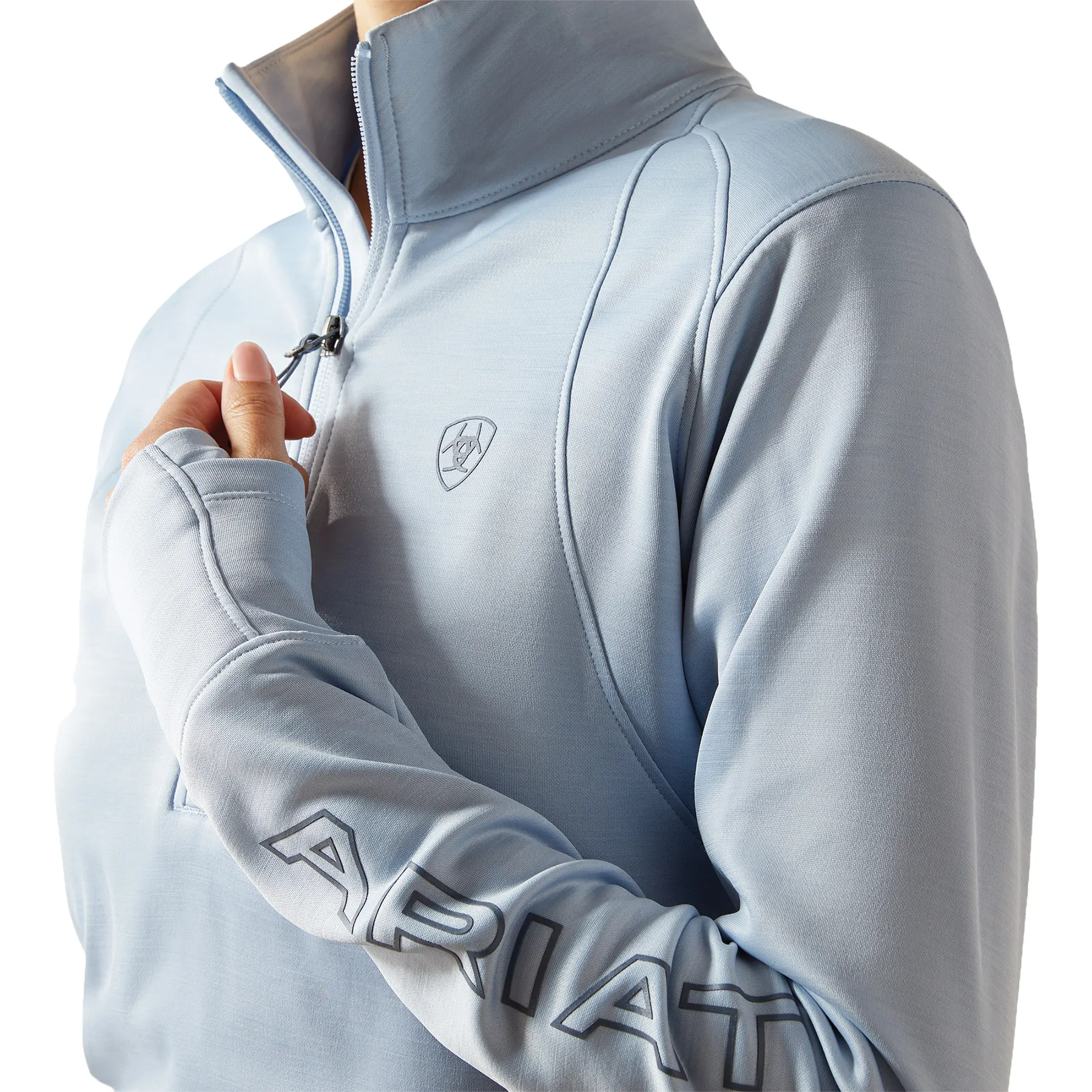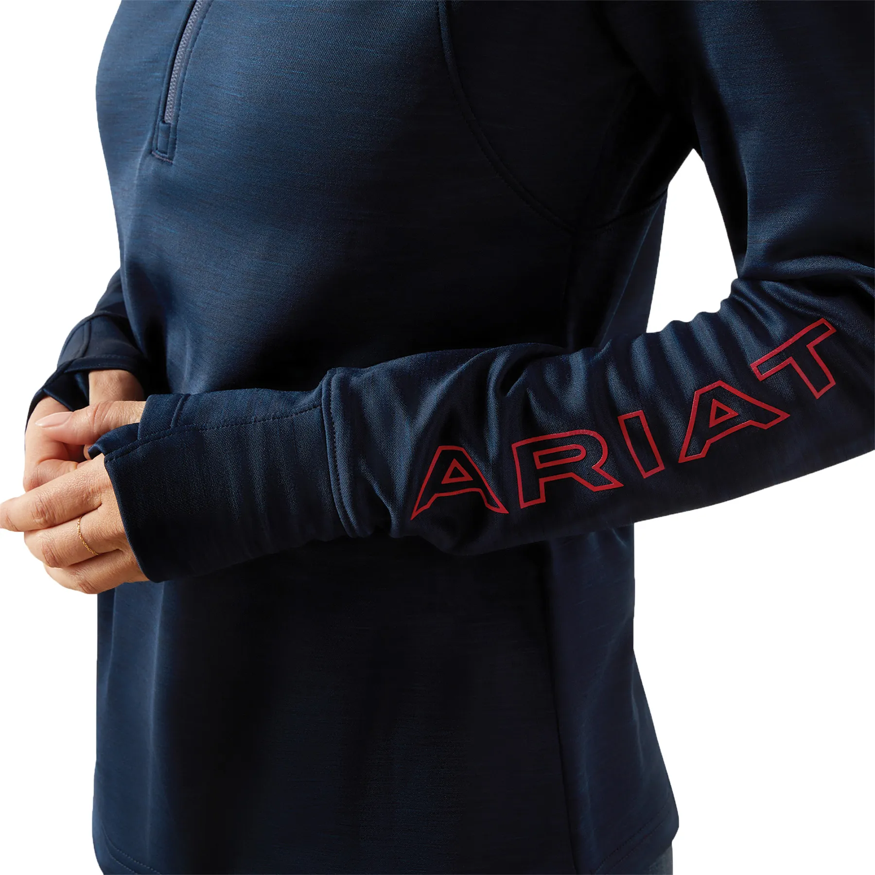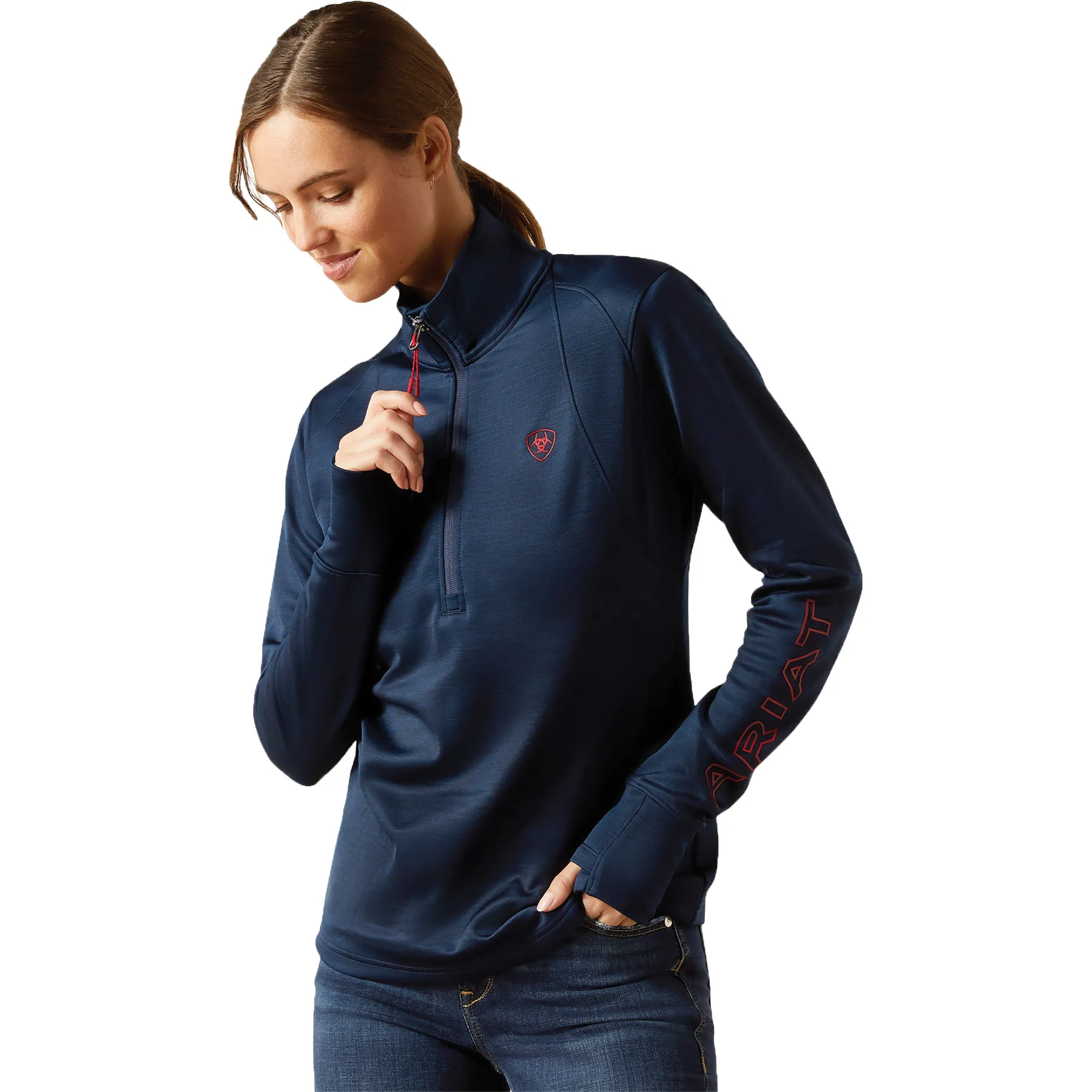 Stay dry, warm, and stylish in this close-fitting technical pullover built for performance. Crafted from recycled stretch fleece, it moves with you while offering cozy mid-weight warmth. Ariat's Moisture Movement Technology™ keeps sweat at bay, while thumbhole cuffs and subtle embroidery add both function and flair. Designed with sustainability in mind, it's the ideal layer for breezy barn days or cool morning rides.