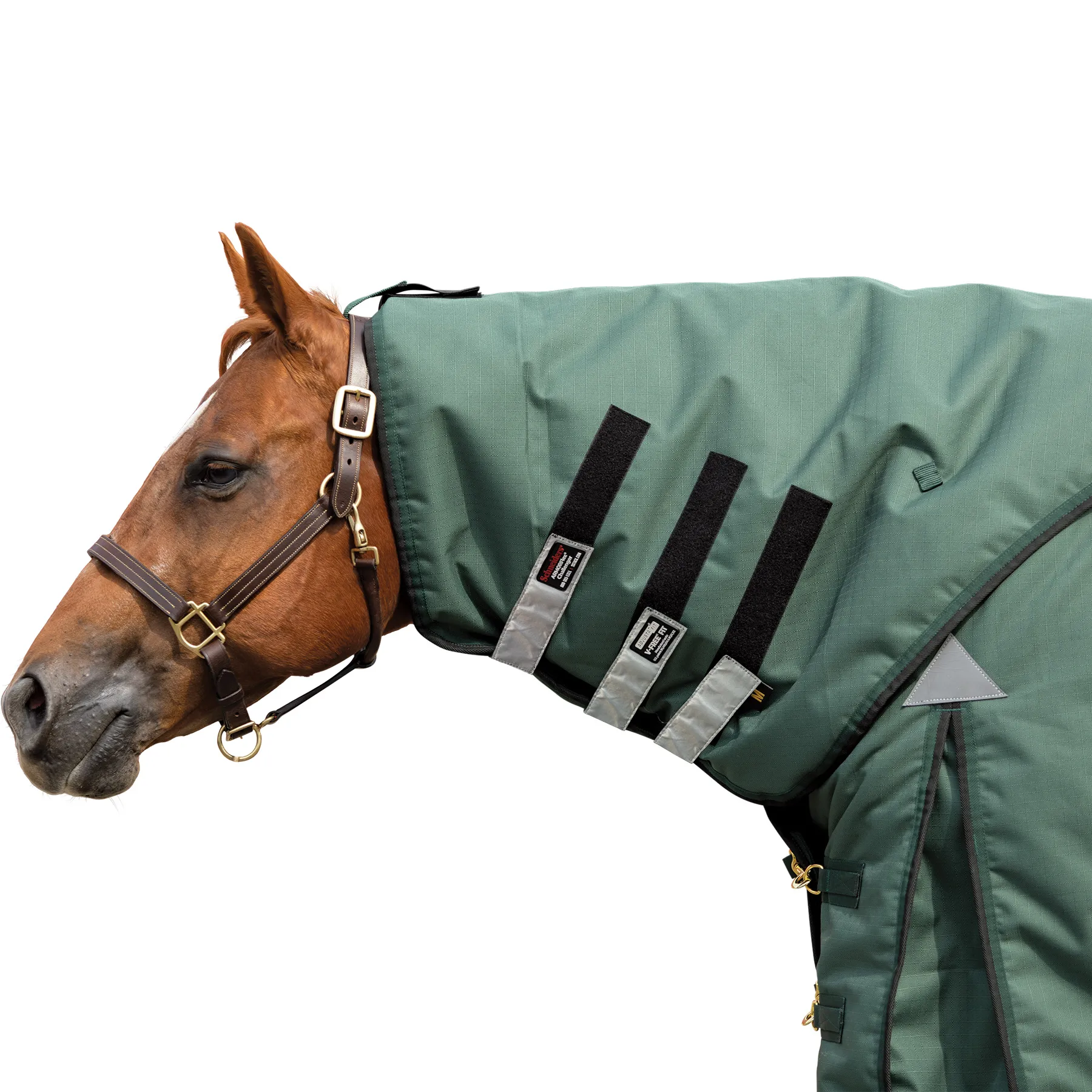 Complete your horse's turnout wardrobe with this matching neck cover. With incredible waterproof and breathability ratings, 3M Teflon coating, and 3M reflective patches on the hook and loop straps, your horse will stay protected. It fits all ARMORFlex® Challenger II V-Free® and Cutback Fit Turnouts, providing a cohesive and comfortable look. Made from a 1200D Ripstop Polyester Outer that's extremely durable for the most playful horses, a Medium Weight (220 gms) Insulation, and a comfortable and breathable nylon Lining. It features a wider binding and reinforced stitching for extra durability. Designed with a halter tab, but stays in place without having to use a halter.