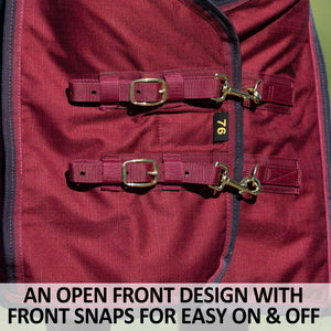 The snap front closure with a hook and loop assist gives you easy adjustability and super-fast on/off, perfect for chilly barn mornings or late-night turnouts.