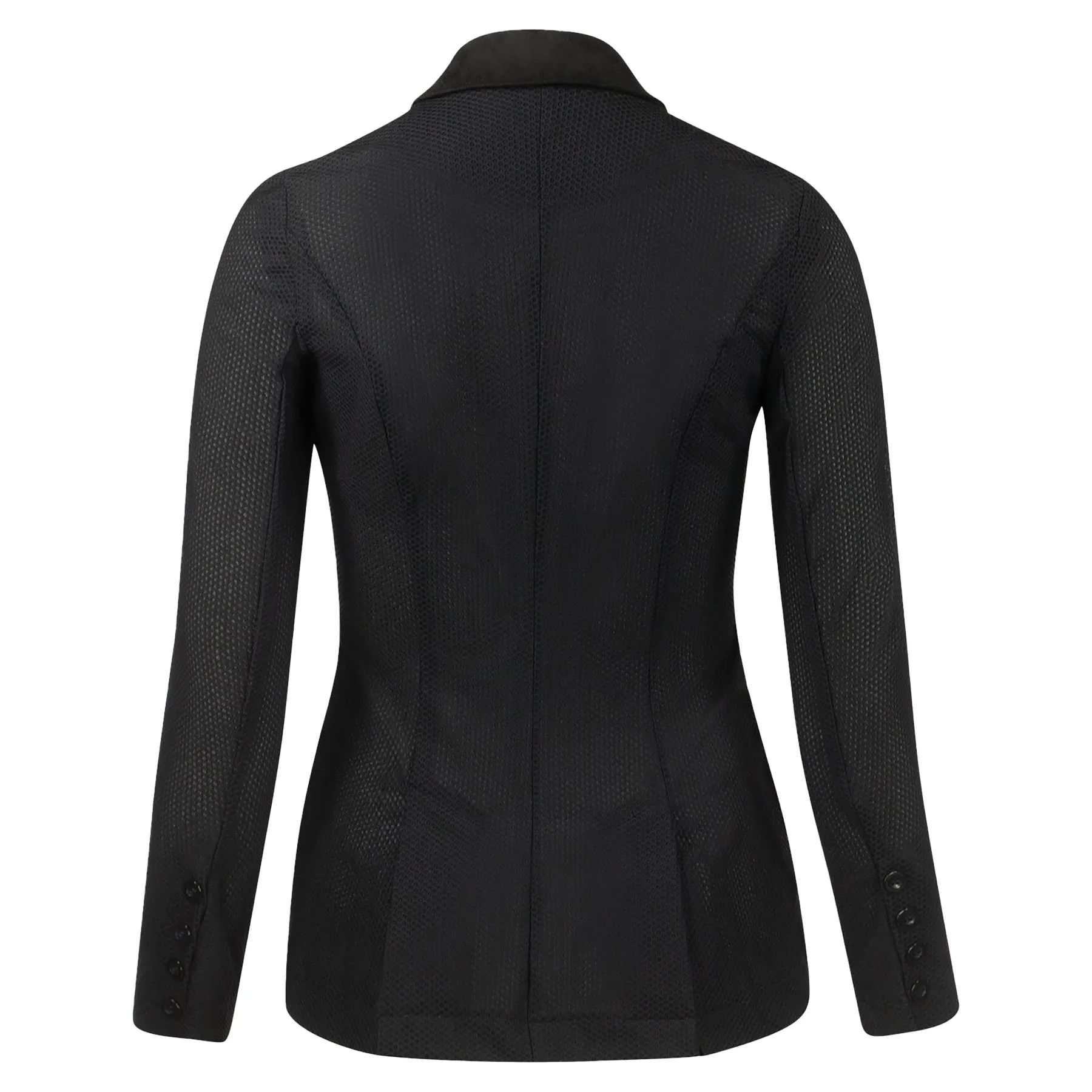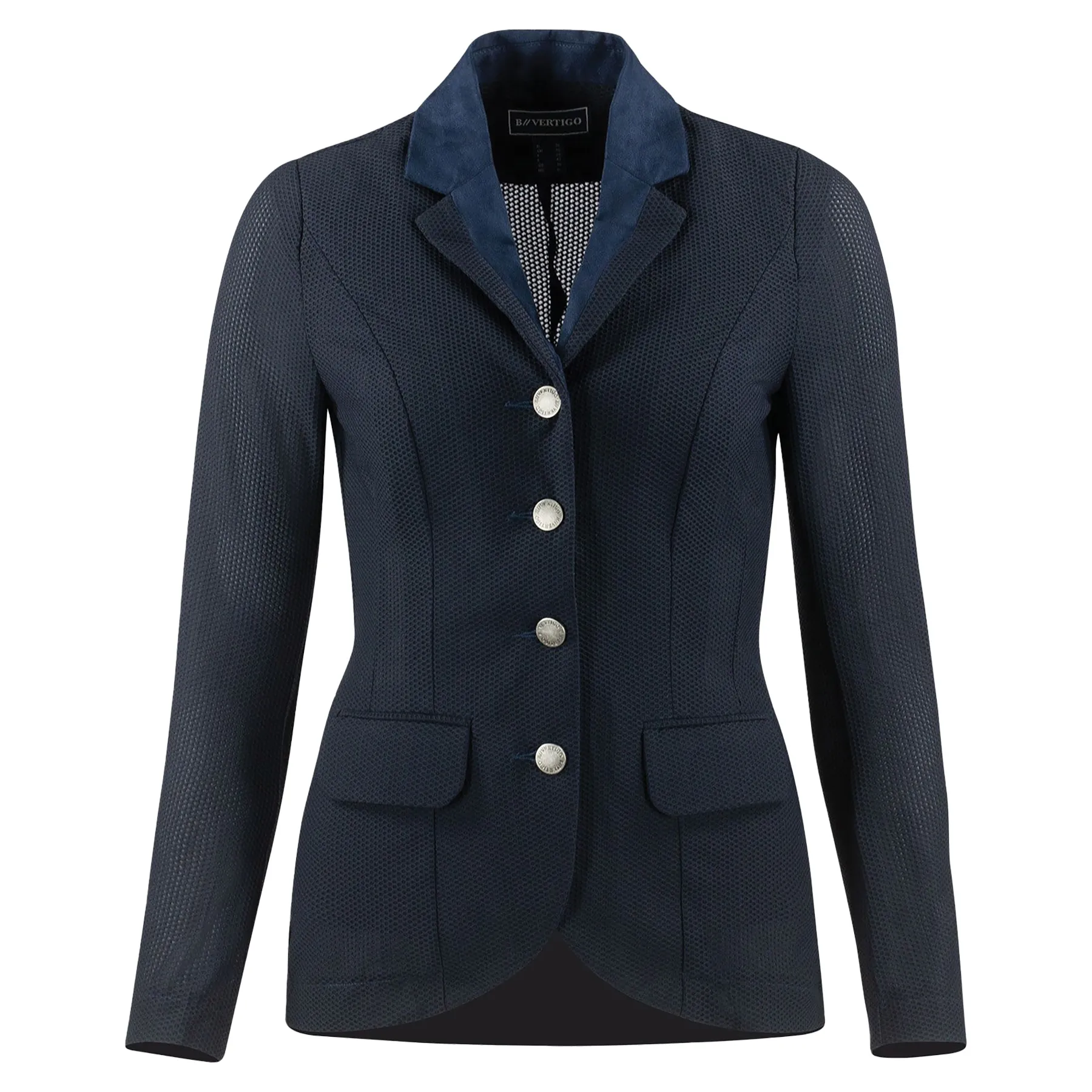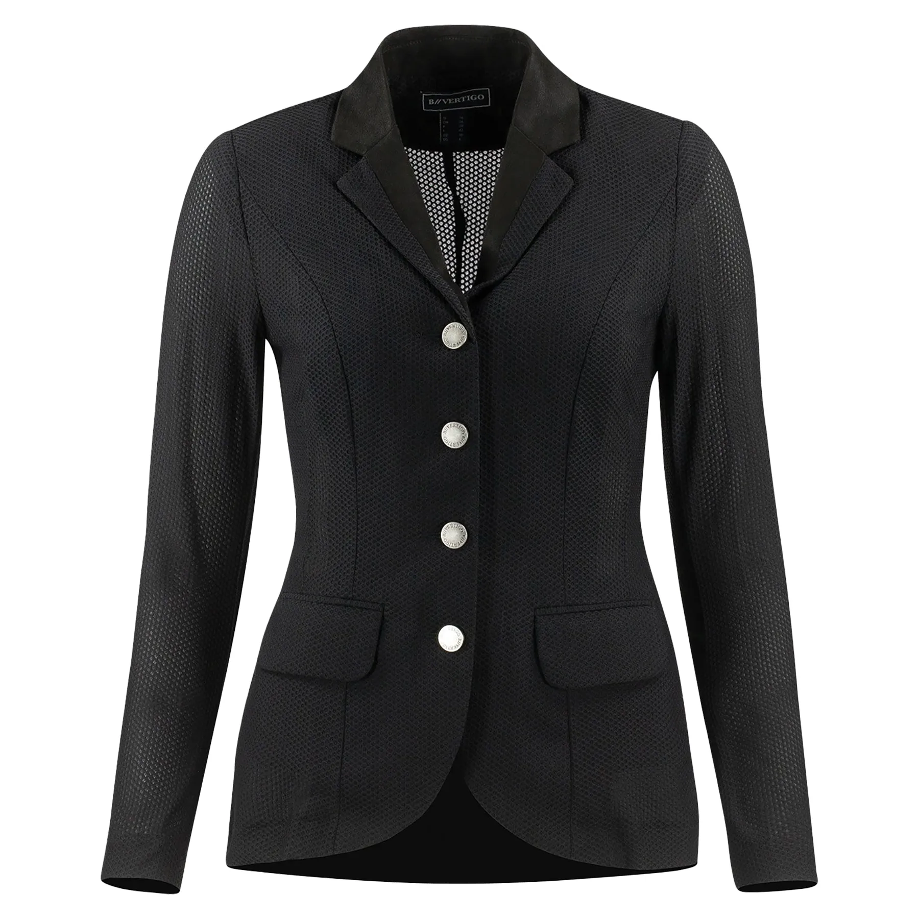 Step into the ring with confidence and cool comfort in the B Vertigo Ladies Gabrielle Mesh Show Jacket. Crafted from ultra-breathable mesh, this lightweight jacket keeps you feeling fresh without sacrificing style. Its stretchable fabric allows unrestricted movement, while the tailored fit and chic design ensure a polished, professional look. Durable jeans-style buttons offer a stylish and long-lasting finish, making this your new favorite show staple.