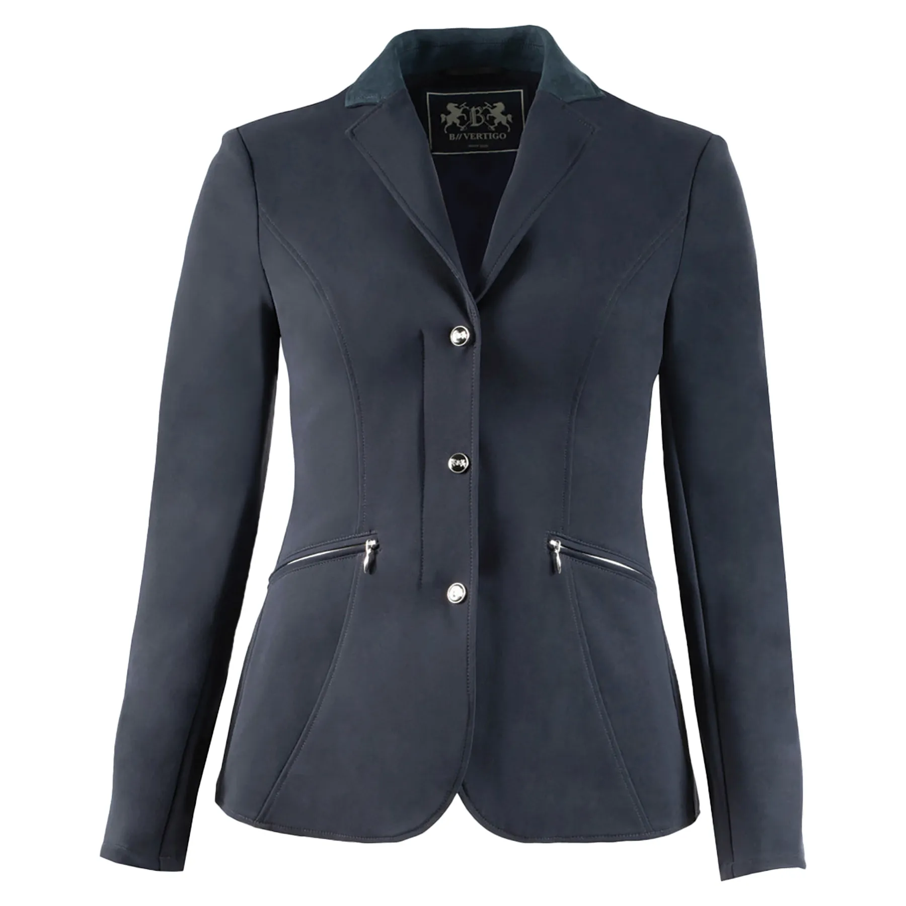 The B Vertigo Ladies Sonia Softshell Show Jacket is your secret weapon for a polished look and peak performance in the ring. Made with lightweight, breathable softshell fabric, this jacket offers a comfortable stretch fit with elegant piping and refined detailing throughout. A hidden metallic zipper behind the front buttons ensures a smooth, gap-free finish, while rear vents and slant pockets create a flattering silhouette. Designed for comfort, style, and long days at the showgrounds, this jacket brings show-ring confidence to every ride.