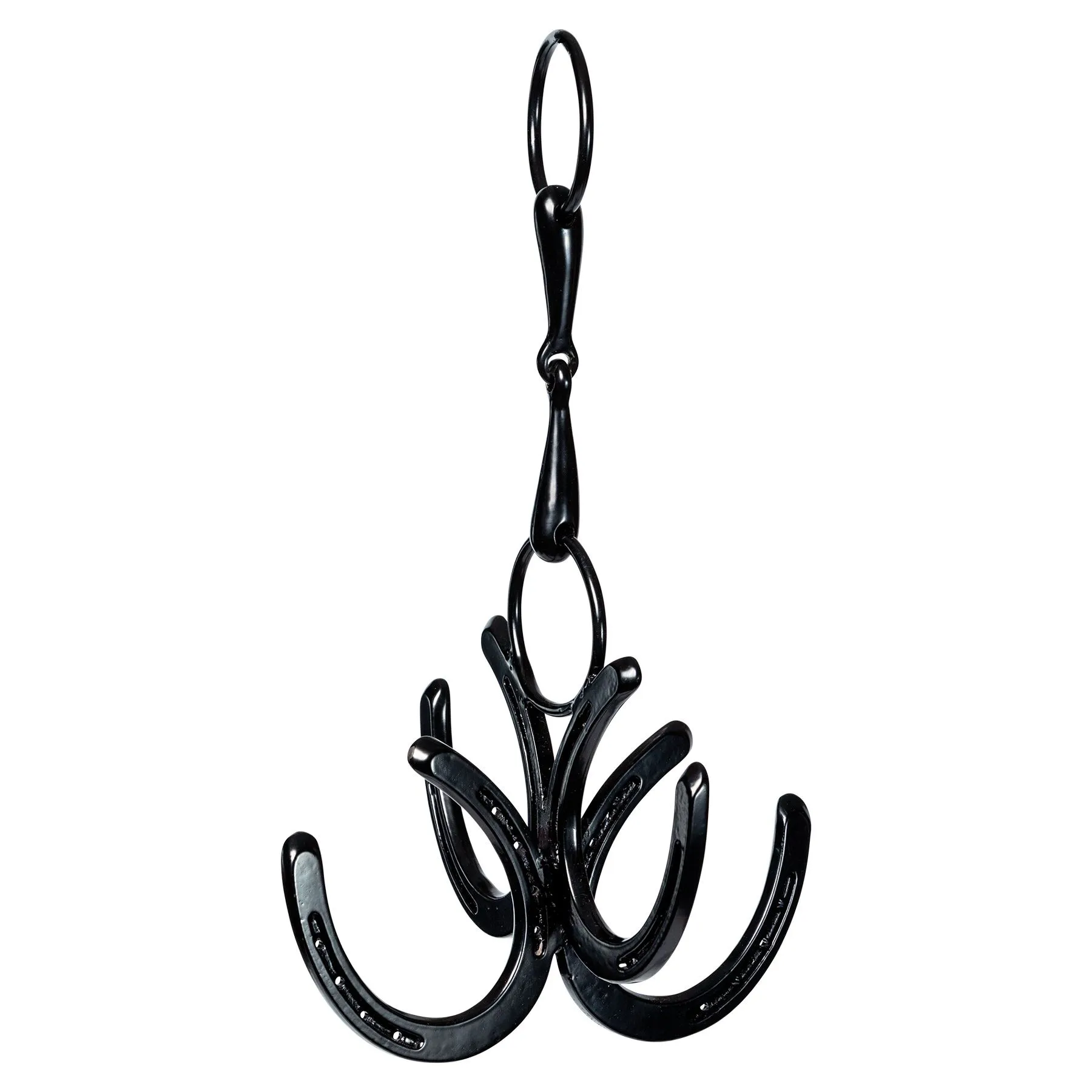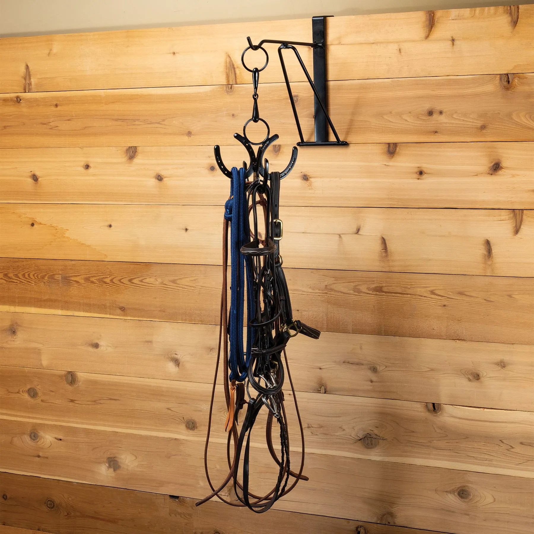 - Unique design with three horseshoe tack hooks and a snaffle bit hanger