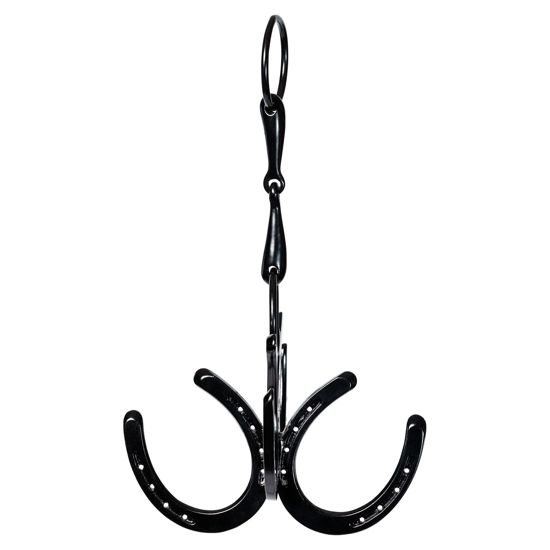 This horseshoe tack cleaning hook collection by Berlin Brass adds a unique style to your stable or tack room. This beautifully crafted piece combines functionality with charm, showcasing a solid horseshoe and snaffle bit motif. It not only provides practical storage for your equestrian gear but also serves as a decorative statement. Whether you prefer the classic shine of solid brass or the sleek sophistication of the black powder-coated finish, this hanger simplifies organizing bridles, girths, halters, horse blankets, and sheets while infusing elegance into your space.