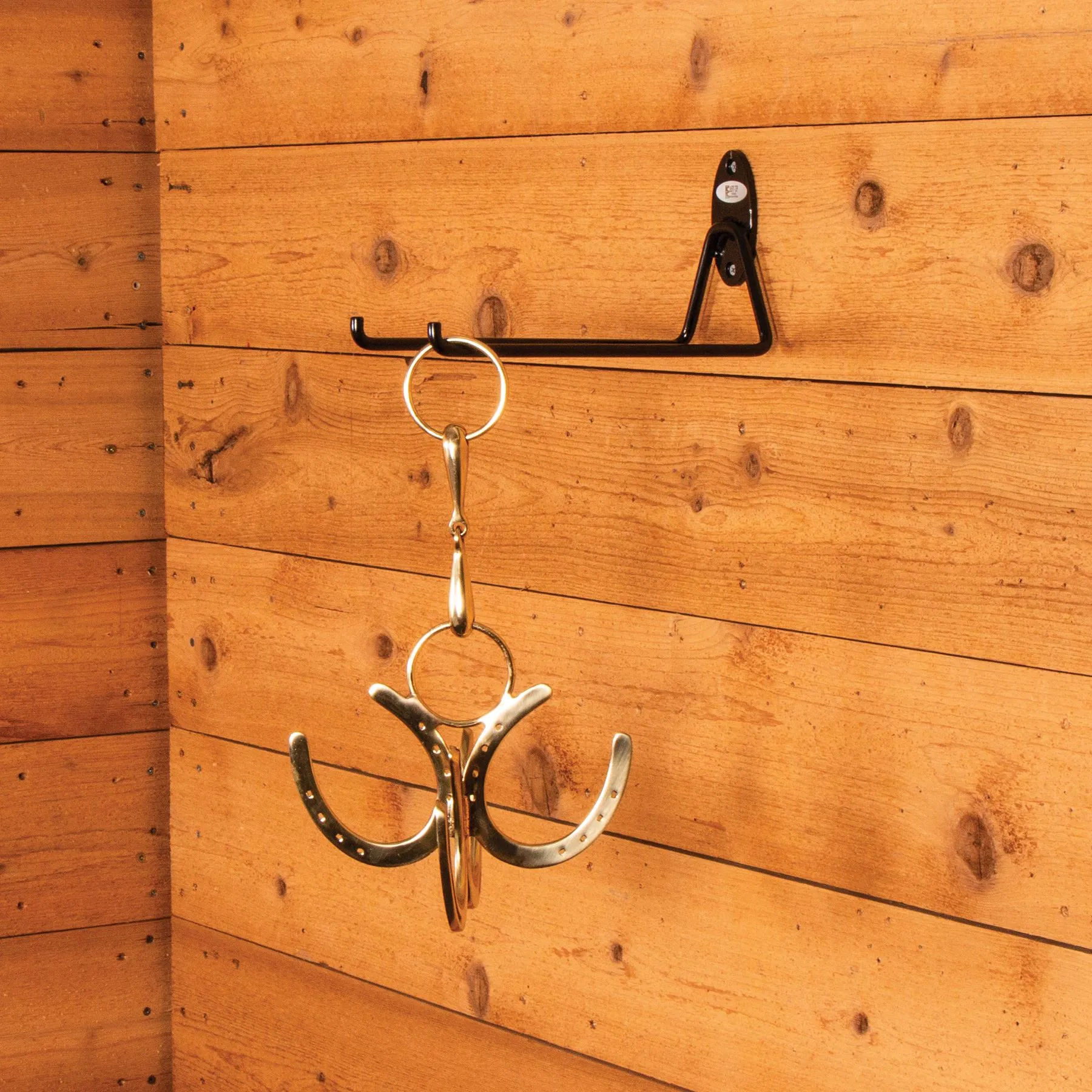 - Unique design with three horseshoe tack hooks and a snaffle bit hanger