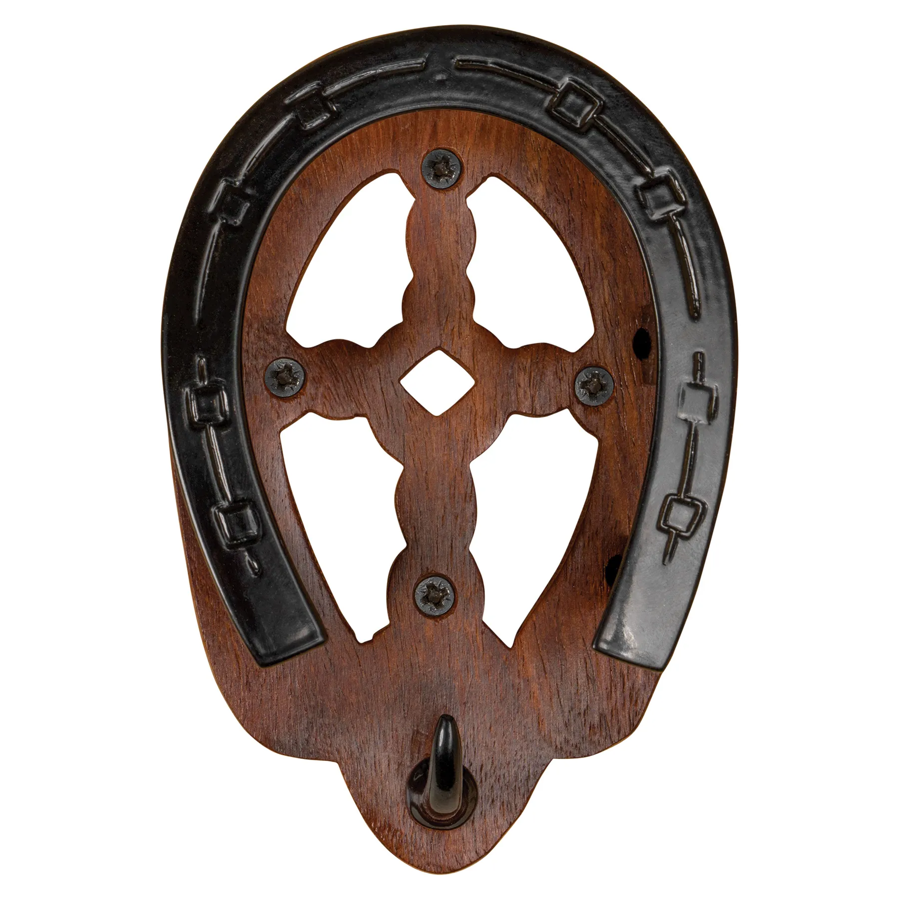 - Carved wood back plate, black brass horseshoe hook, and an additional small lead hook for hanging your lead ropes, girth, martingale, or spurs