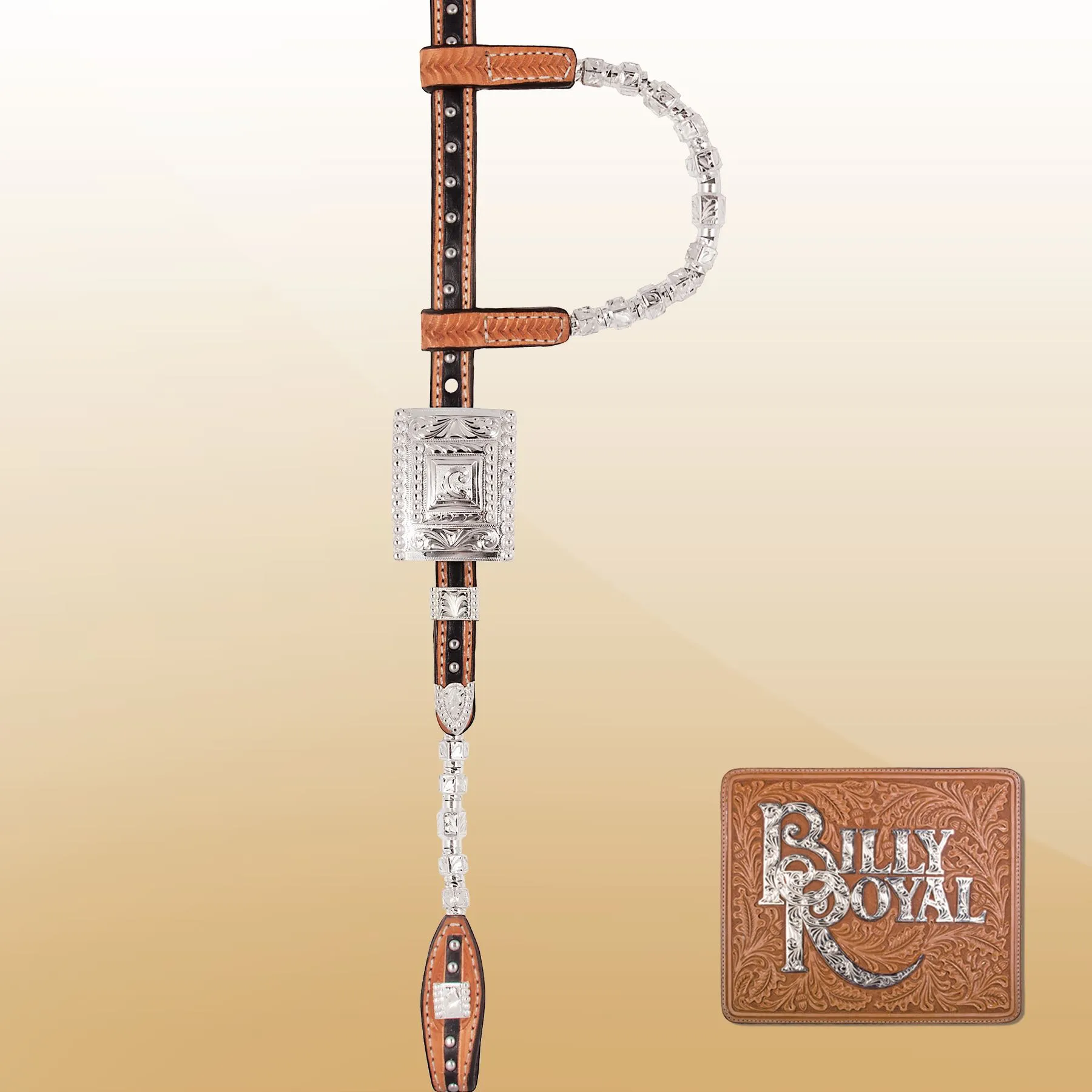 This classic two-ear headstall is meticulously crafted from top-tier, beautifully finished Grade A leather. It features silver-plated hexagon ferrules on the cheeks and ears, complemented by large, hand-engraved square buckles on each side. The unique black leather inlay is intricately detailed with embedded stainless dots, lending a sophisticated touch to this two-ear style headstall in light oil.