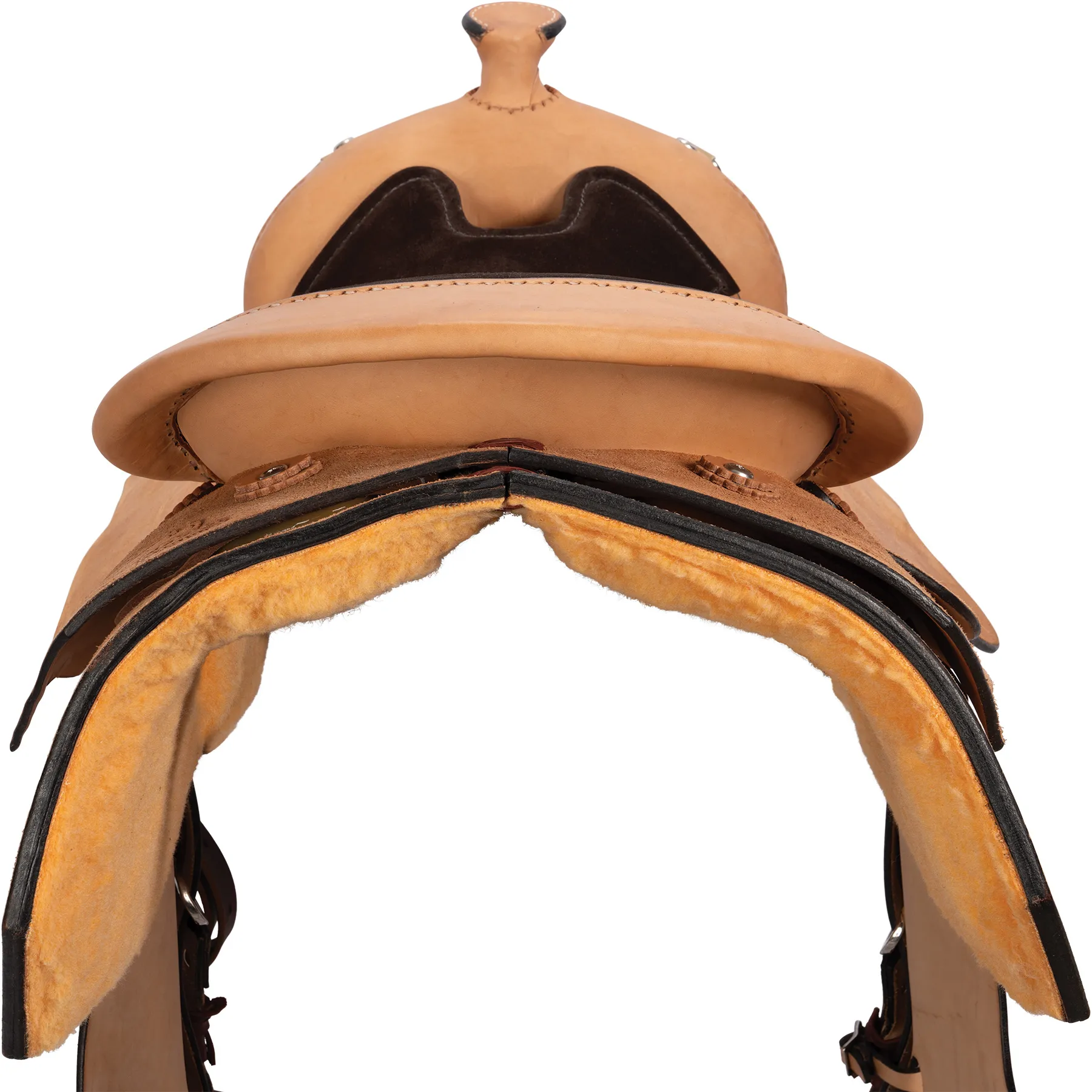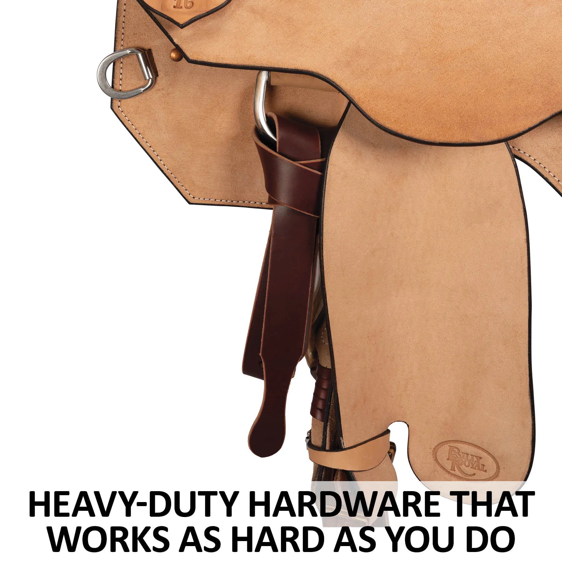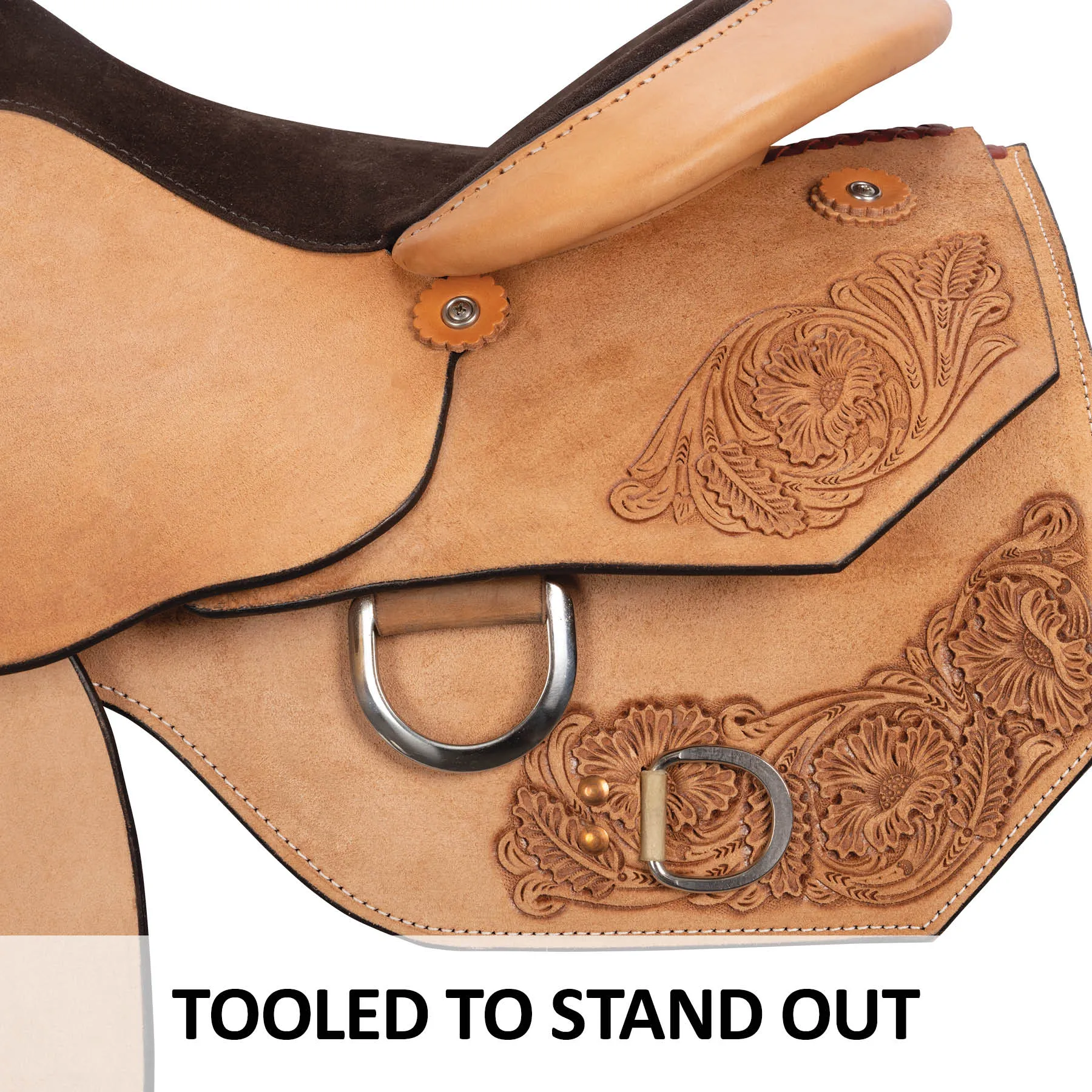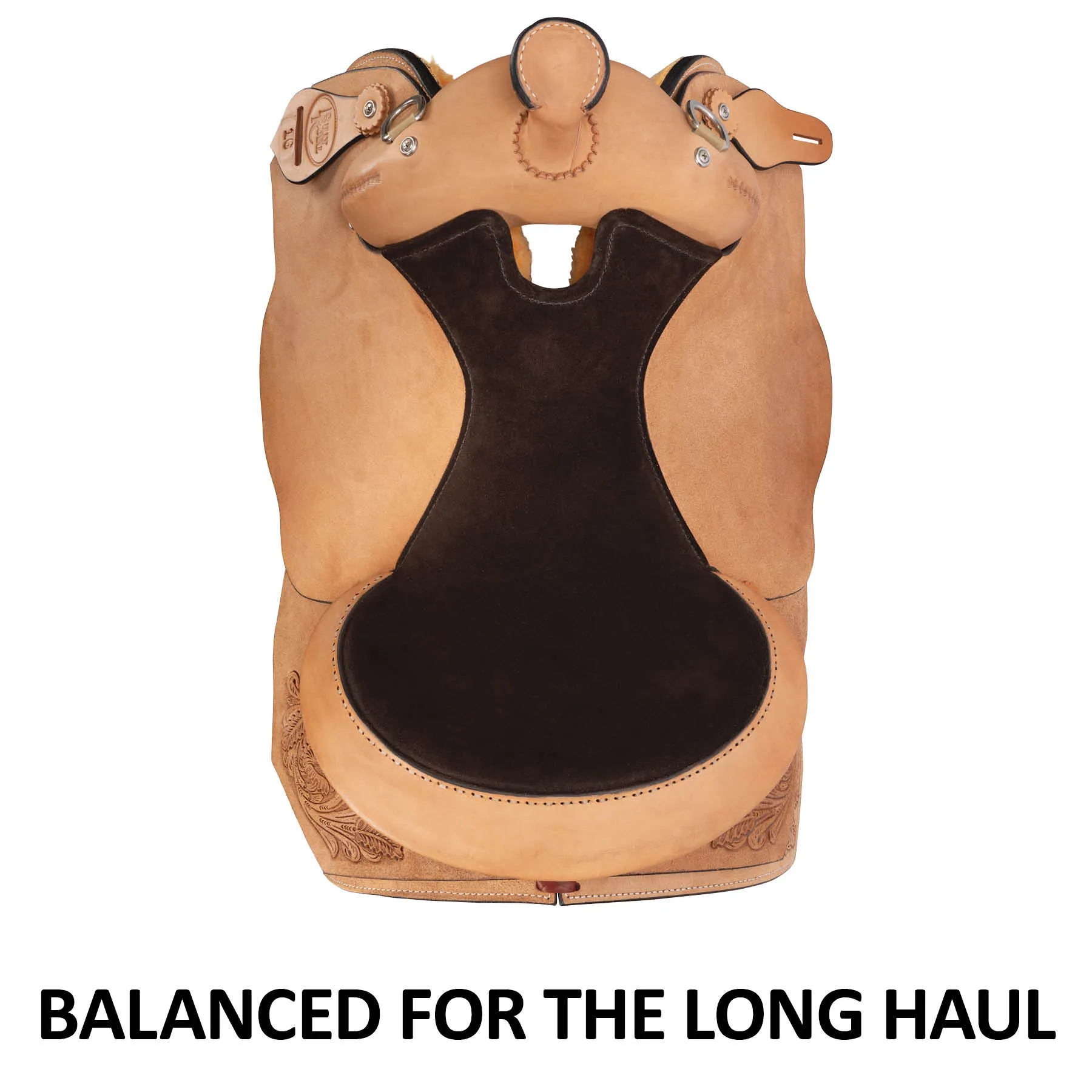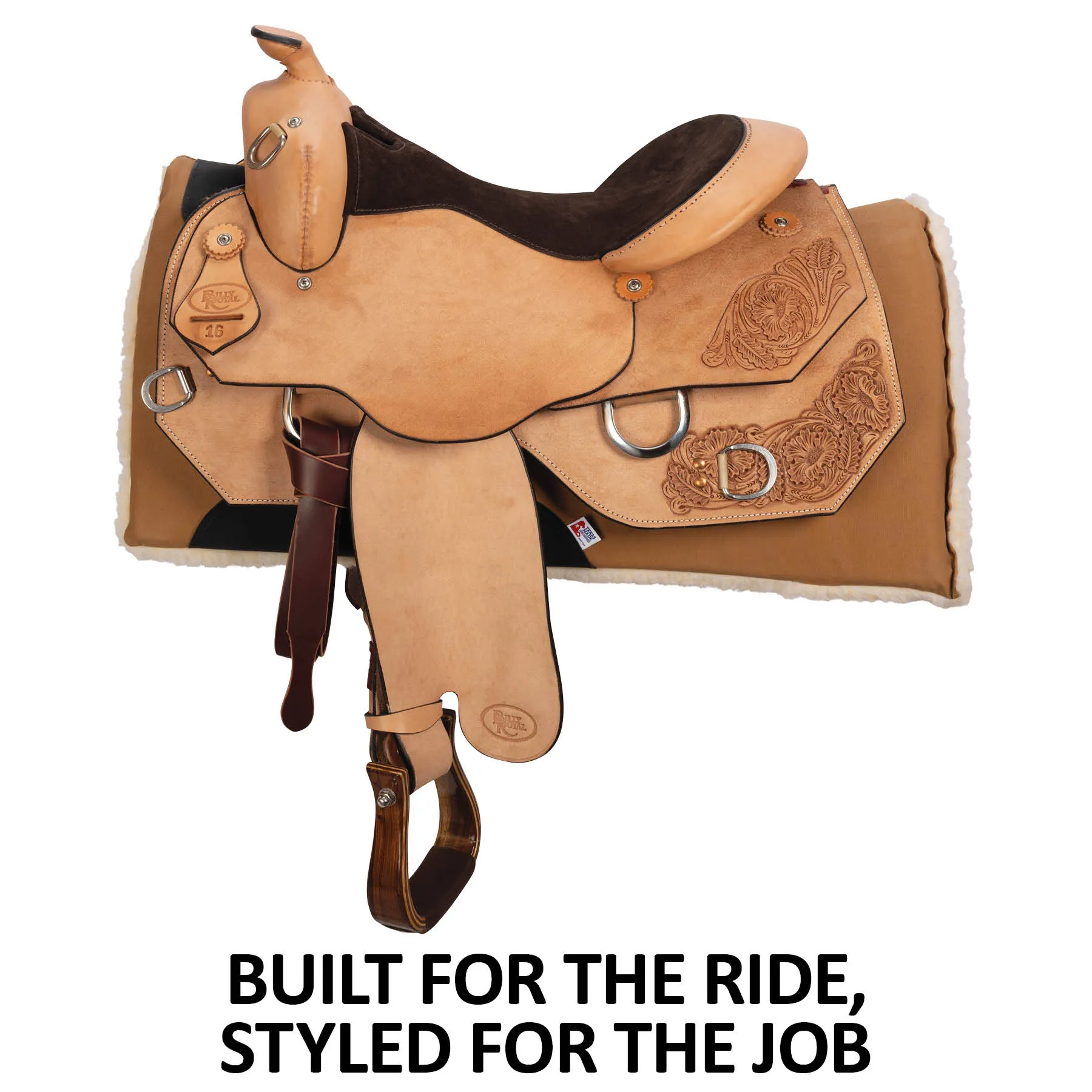 The Billy Royal® Elite Tooled Roughout Work Saddle is crafted in the USA on a lightweight, balanced pine tree made to fit modern horses. Designed with all-day comfort in mind, it features a padded seat, plush sheepskin lining, and sleek stainless-steel hardware. Finished with floral and leaf hand-tooling, it's as functional as it is eye-catching, perfect for the rider who puts their gear to work and still wants to look good doing it.