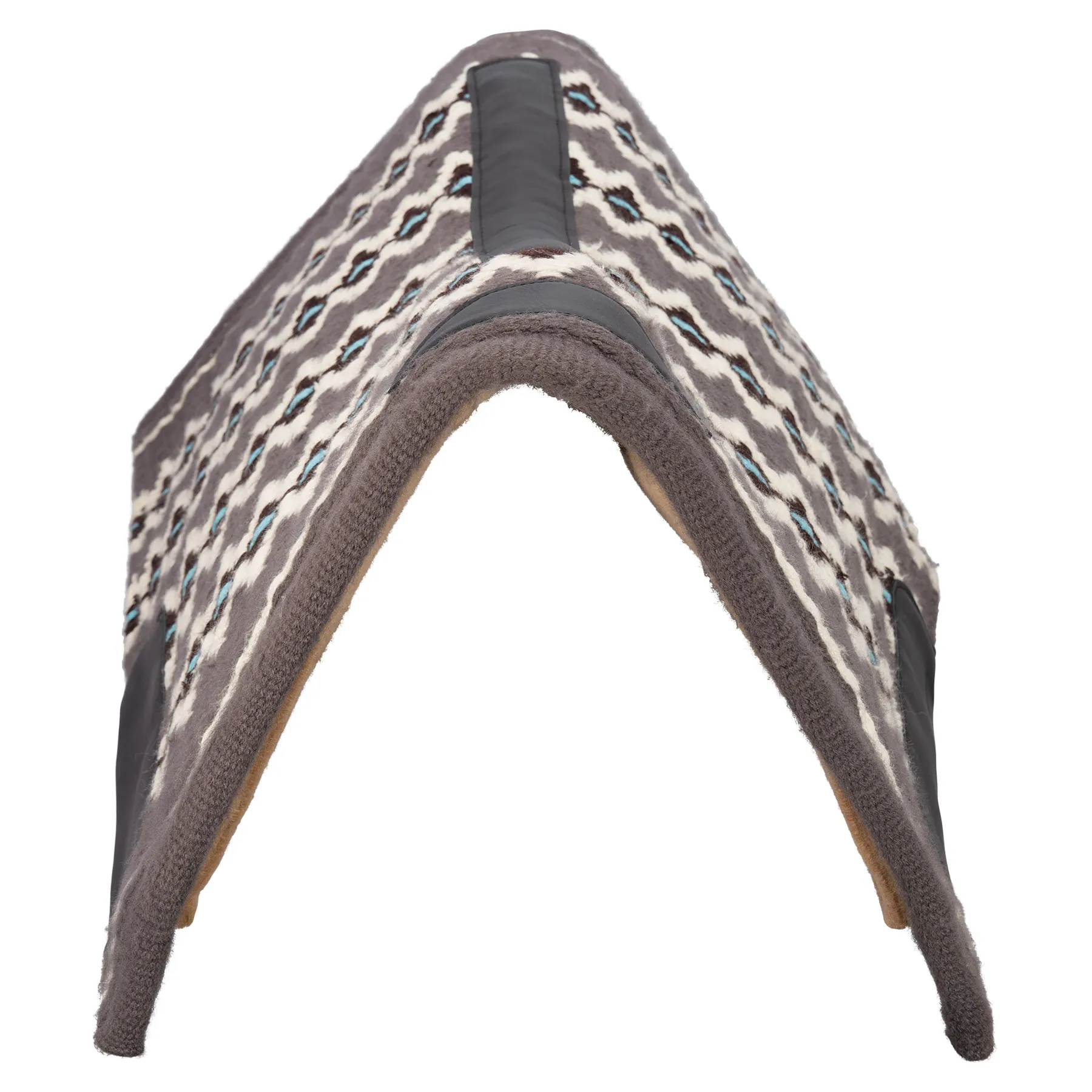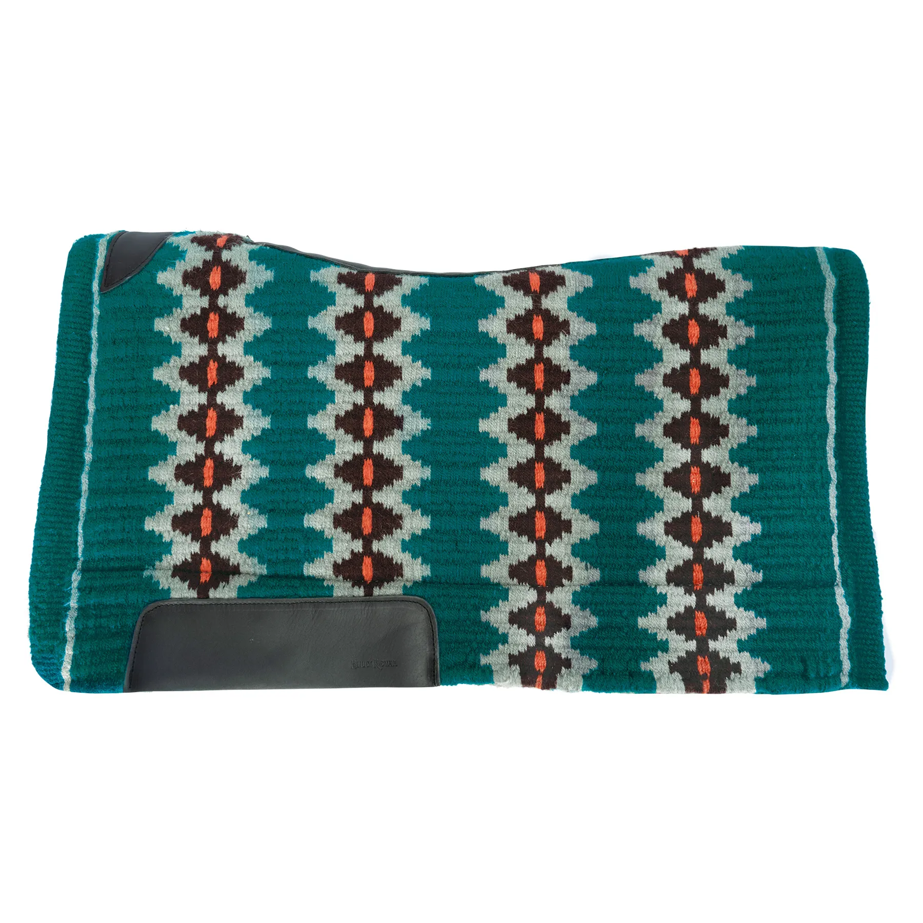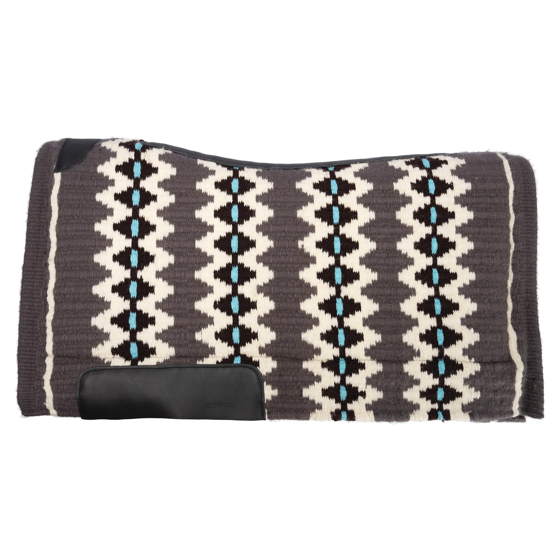 Turn heads in the show ring with this beautifully crafted blanket top pad, designed to blend rich Western style with performance comfort. Featuring a dense, tightly woven New Zealand wool top in striking shades of teal, tan, and gray, it's paired with a shock-absorbing 3/4" synthetic felt lining. Naturally antibacterial and moisture-wicking, it keeps your horse's back cool, dry, and comfortable, while the contoured design ensures a secure, pressure-free fit under your saddle.
