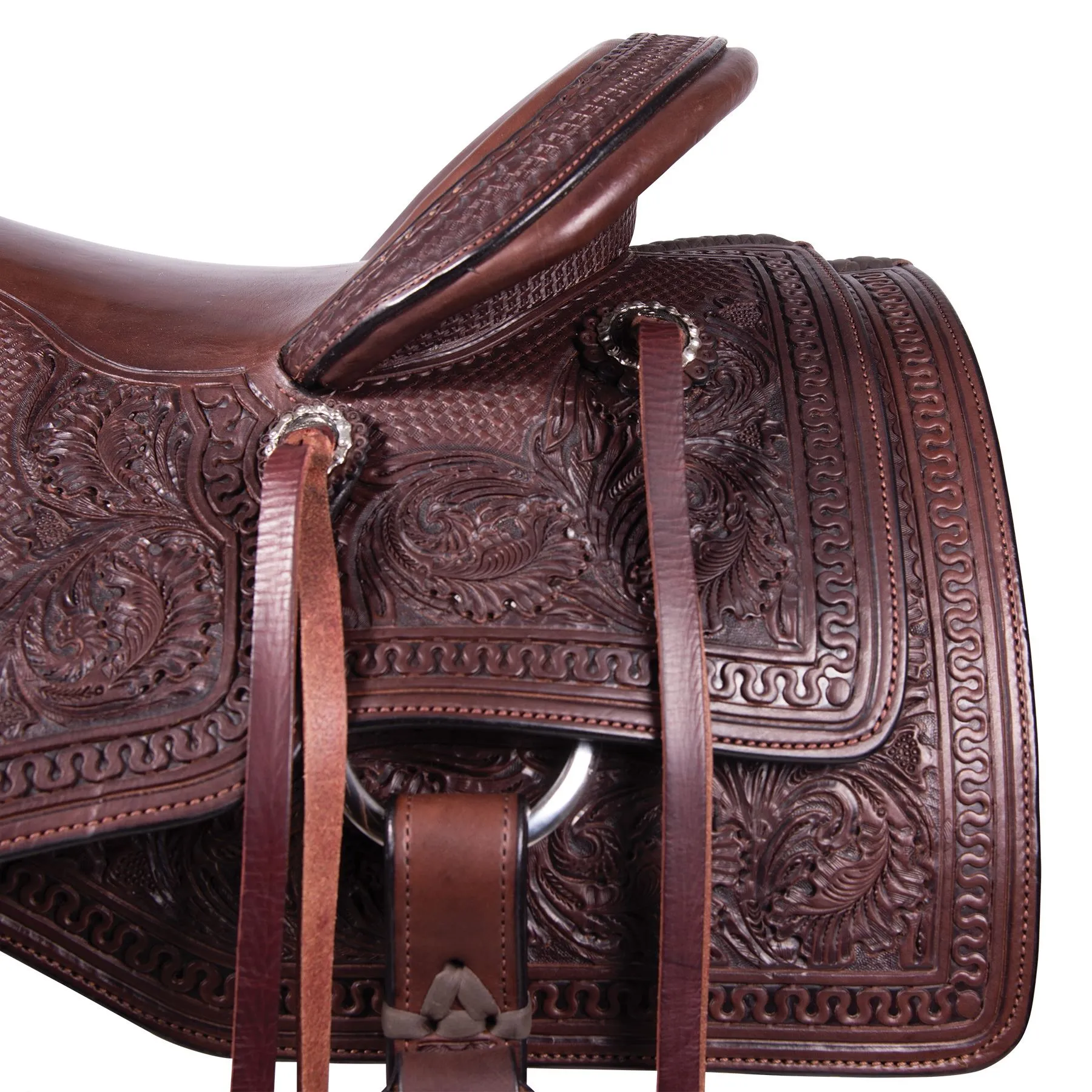 - Fine hand-tooled basket weave and Entz tooling with a delicate running W-tooled border