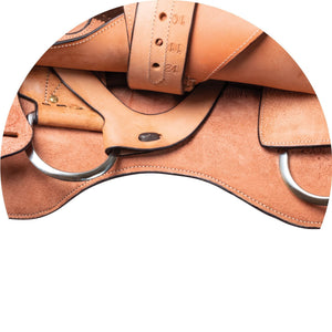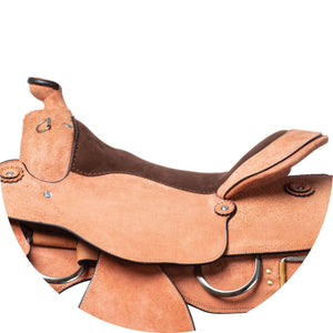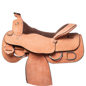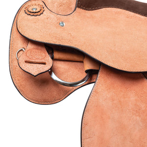 This saddle is designed with an emphasis on comfort and versatility. The generously hand-padded seat ensures a comfortable ride, while the rawhide-covered trees provide a snug fit for your horse. The Grade A roughout leather is extremely durable and supple, breaking in quickly for a comfortable feel. Additionally, the reinforced stainless steel rings at the front and back accommodate all training aids, and the nylon tie strap and leather off-billets add to the saddle's practicality and ease of use.