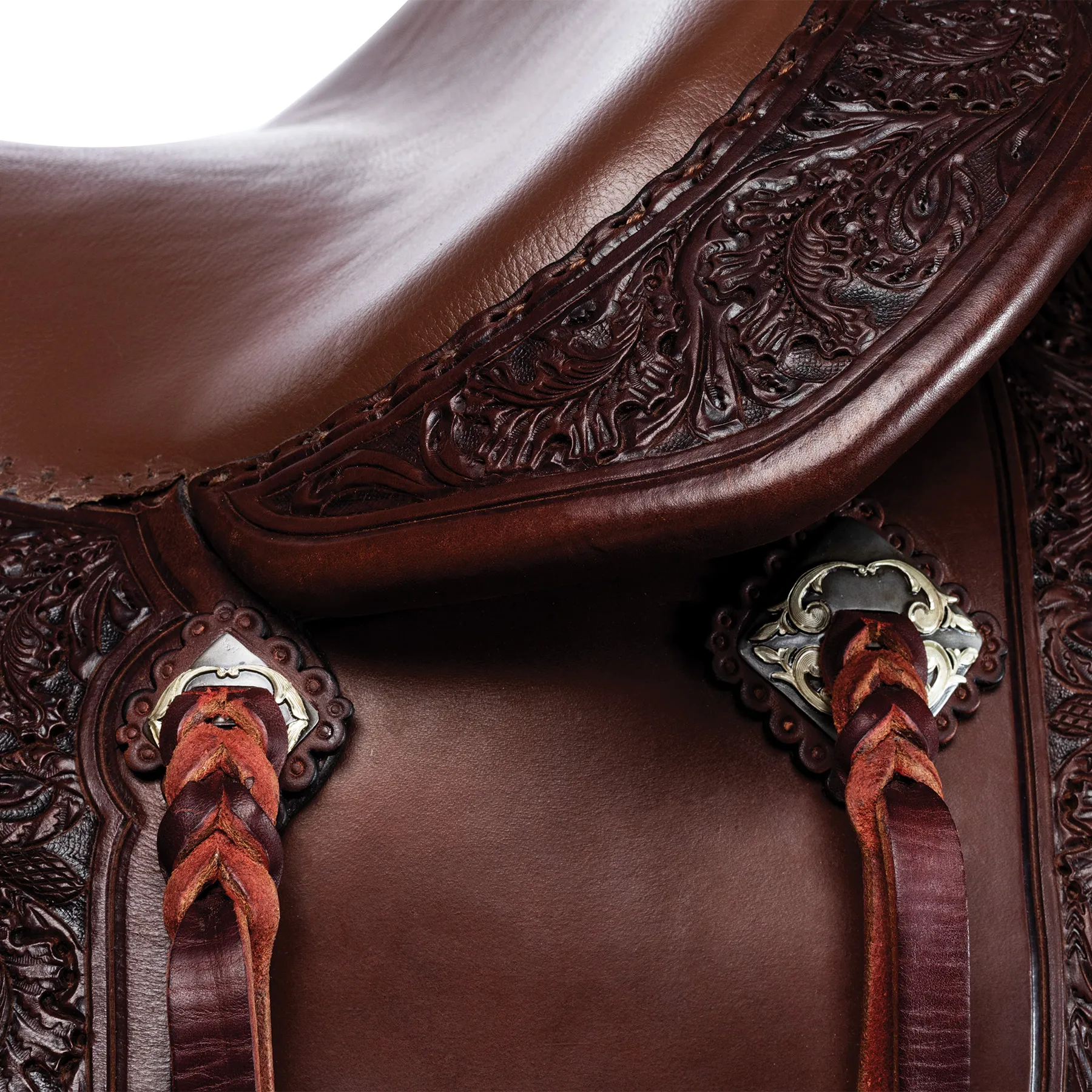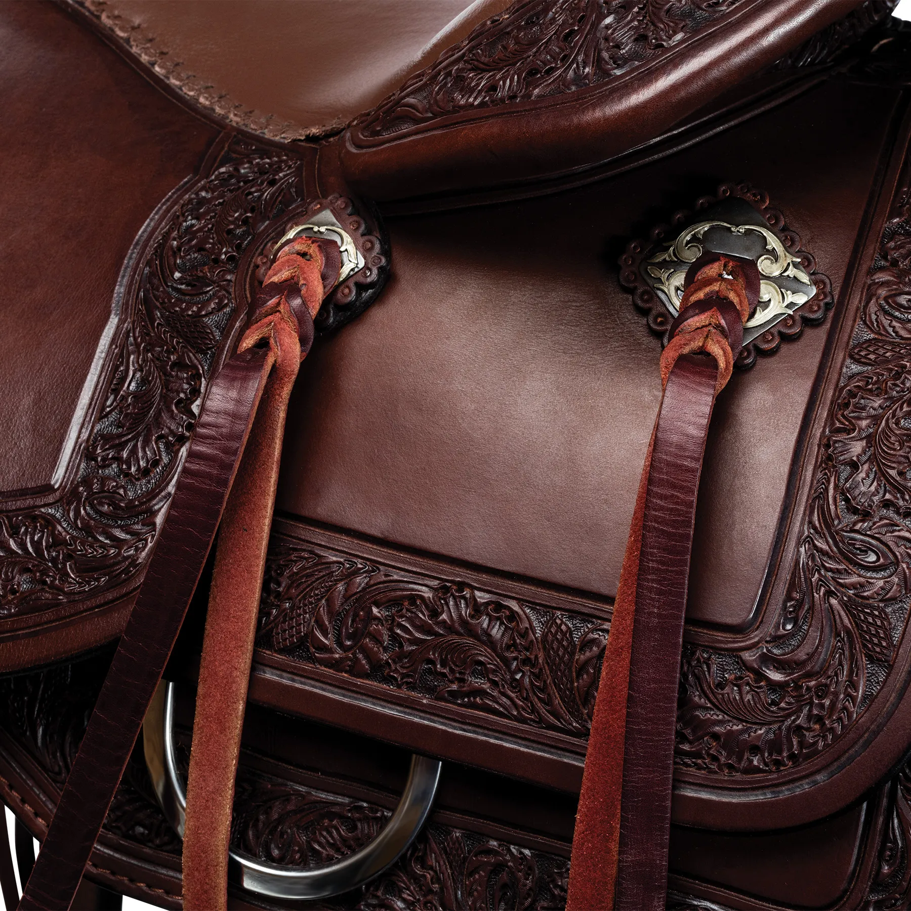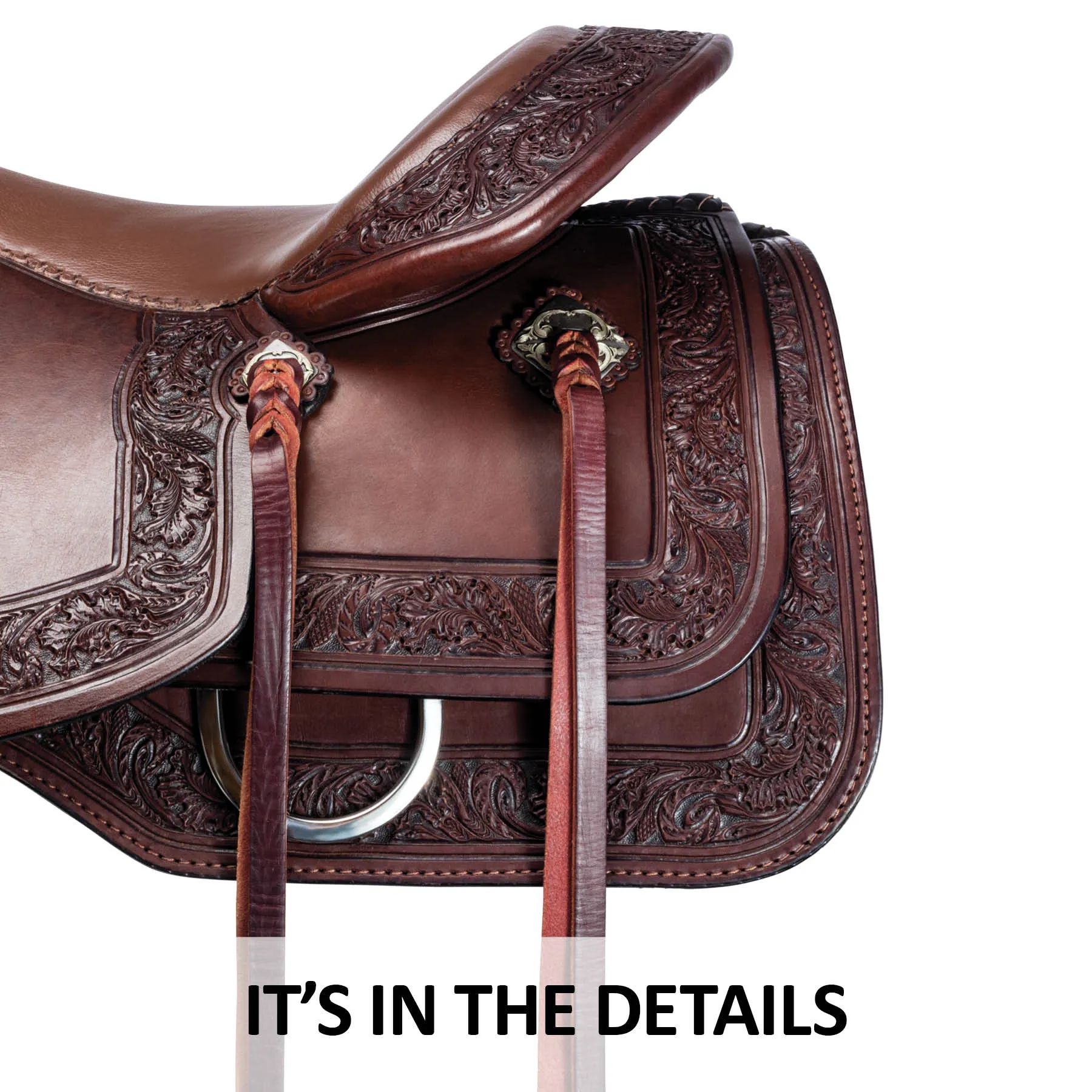 This Western Ranch Saddle is a gorgeous combination of smooth and tooled leather crafted with the finest hand-selected hides and our custom-made wooden tree. It's a versatile saddle, covering Ranch Riding, Cow Horse, Sorting, and Versatility Ranch Horse Discipline. This Ranch Saddle fits today's modern conformations, from Arabians to Quarter Horses, with a lifetime warranty on the tree.