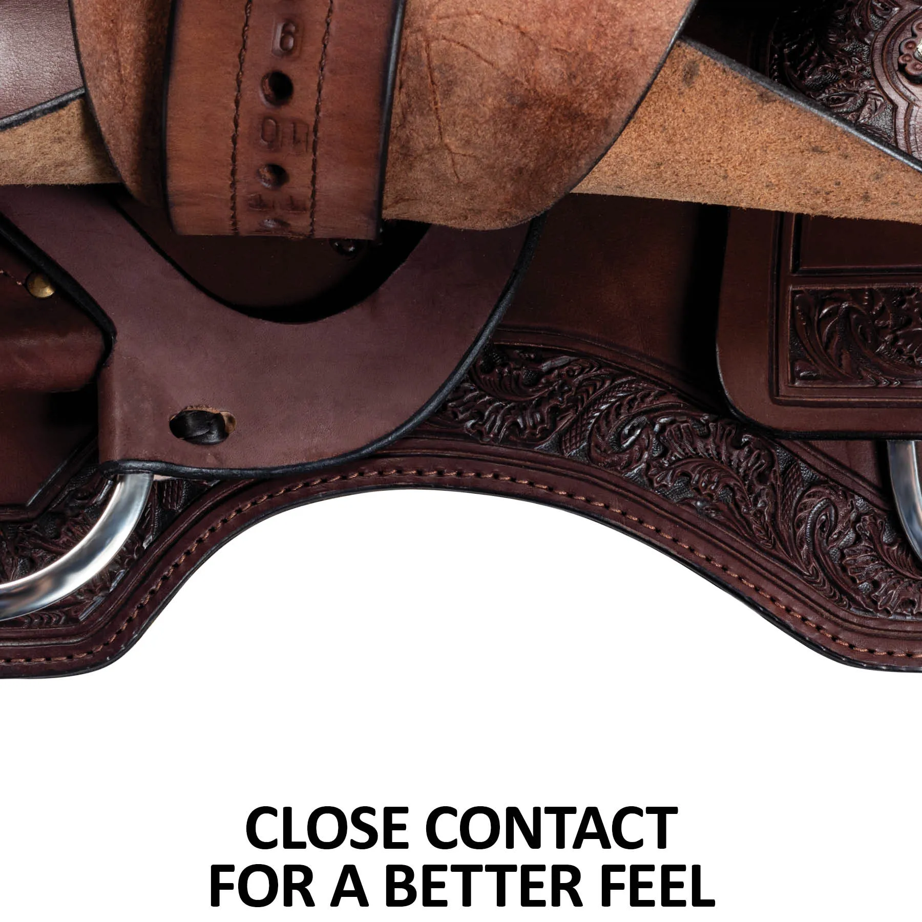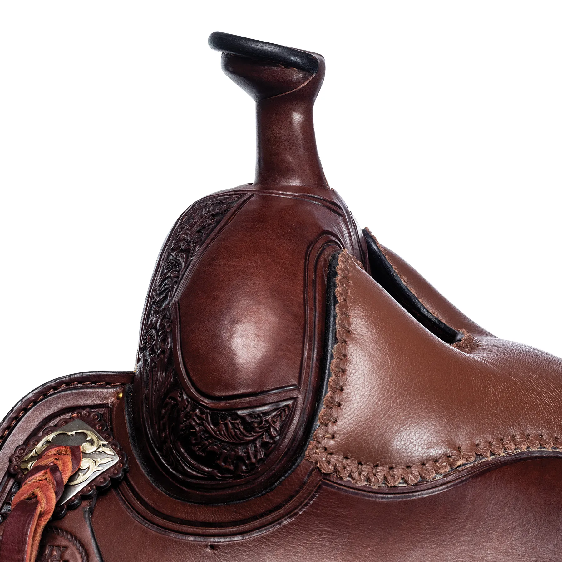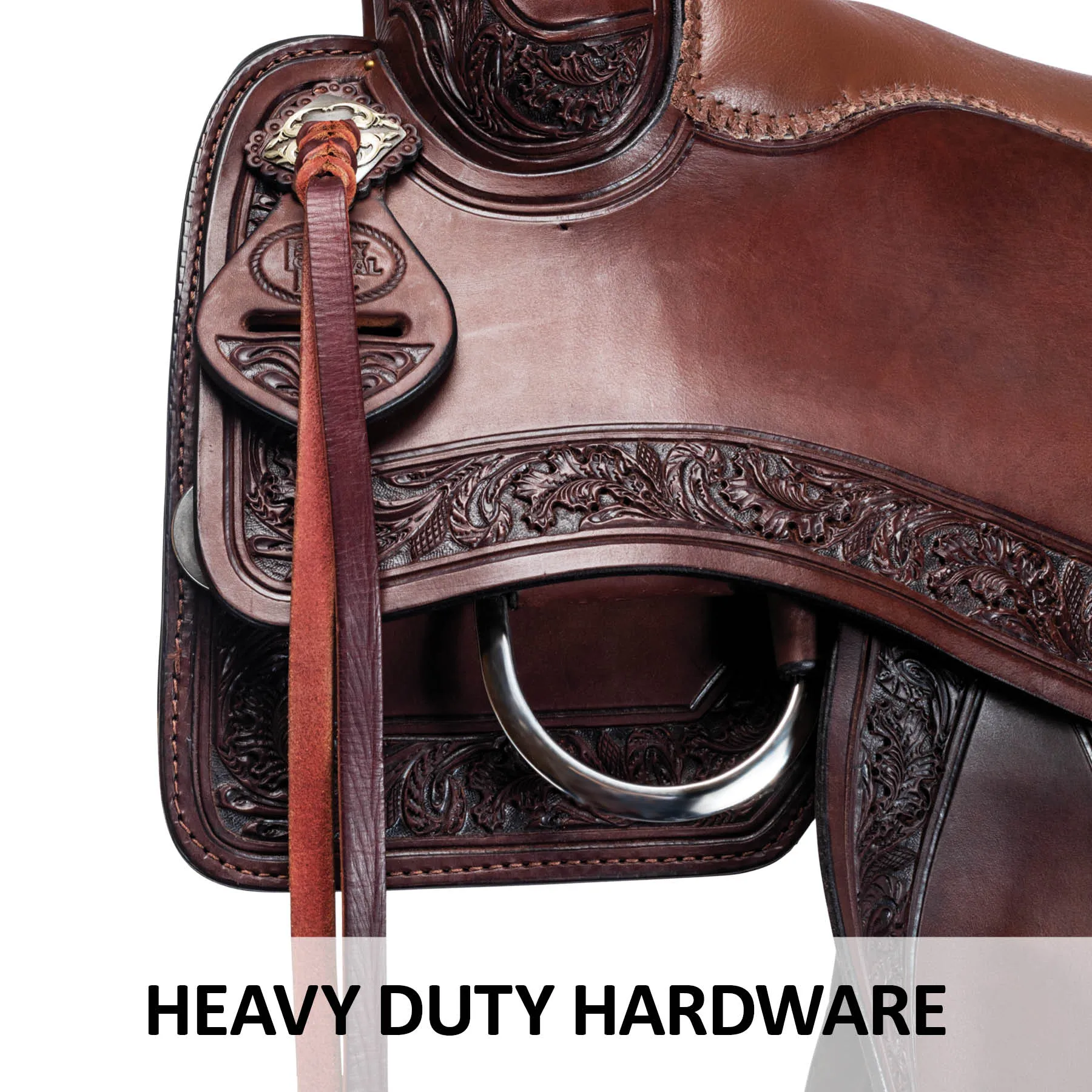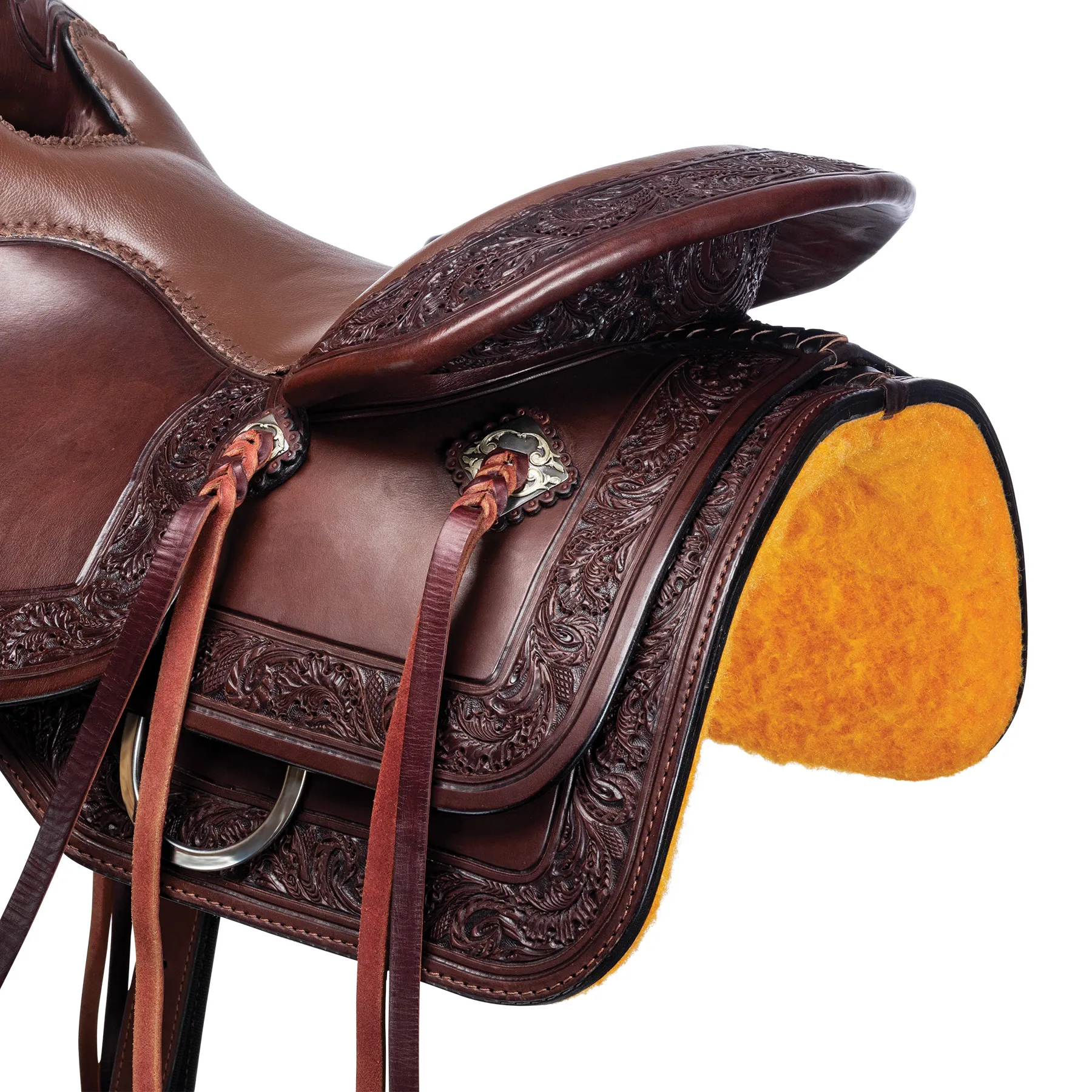 This Western Ranch Saddle is a gorgeous combination of smooth and tooled leather crafted with the finest hand-selected hides and our custom-made wooden tree. It's a versatile saddle, covering Ranch Riding, Cow Horse, Sorting, and Versatility Ranch Horse Discipline. This Ranch Saddle fits today's modern conformations, from Arabians to Quarter Horses, with a lifetime warranty on the tree.