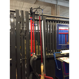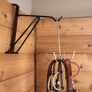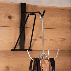 This is a multi-purpose hanger that hangs over a stall board or trailer door to hold tack, clothing or blankets and then folds neatly away when not in use. Completely portable, needs no tools to install and has a bracket that will fit over a standard 2” stall board. Use to hang tack for cleaning, hang clothing in dressing rooms or hang sheets/blankets to air out and dry.