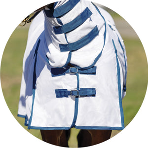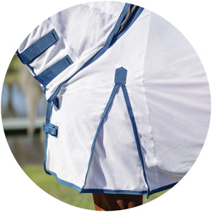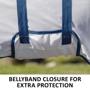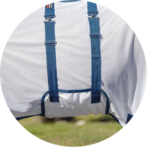 The bellyband closure option protects from flies and midges biting along the sensitive underbelly. Chrome-plated hardware is positioned to avoid rubbing or poking while your horse is lying down, and the t-post hardware on the bellyband closure includes locking bands and incorporates elastic inserts for more give as the horse moves since the proper fit is with the bellyband snug and flush to the belly.