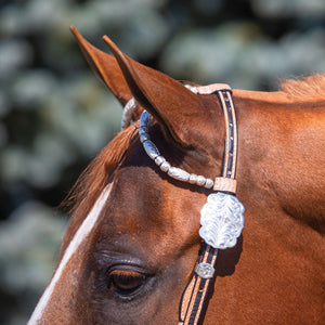 This two-ear headstall with hand-engraved sterling silver plated ferrules is the newest addition to Billy Royal's tradition of trend-setting western gear. Made from top-quality Grade A leather, this light oil headstall is distinguished by its hand-engraved sterling silver plate ferrules in a distinctive barrel, ball, barrel design. The large oval buckles on each side of the cheeks are also hand-engraved, adding elegance.
