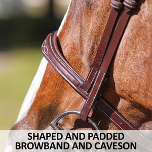 The browband and noseband are fully padded for comfort with a slight shaped design offering more eye appeal on the horse. The browband measures 1 1/2" at the center and tapers to 5/8" and the caveson measures 2" in the center and tapers to 5/8".