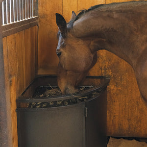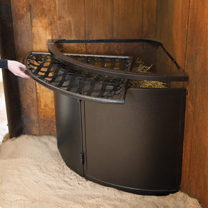 This solid corner floor hay feeder is your go-to solution for reducing hay waste while encouraging your horse to eat more slowly and naturally. Designed with durability and smart feeding in mind, it features a slow-feed netted lid with 1.5" spacing to help mimic grazing behavior. Built tough with reinforced steel and finished in rust-resistant Black Armor coating, it’s made to last day after day, flake after flake. Easy to assemble and even easier to load, it keeps hay neatly contained in the corner of the stall, minimizing mess and keeping your horse happily nibbling.