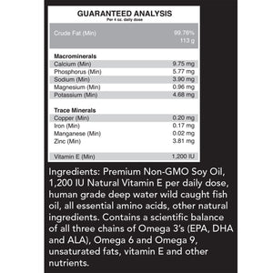 - Soybean oil, deep water fish oil and the tightest ratio of Omega 3’s to Omega 6’s