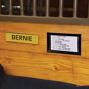 Horse signs and horse stall nameplates add a classy, professional look to your horse’s halter, bridle, stall or even the front door or mailbox of your stables. Schneiders has engraved equine nameplates made of brass, nickel, and more.