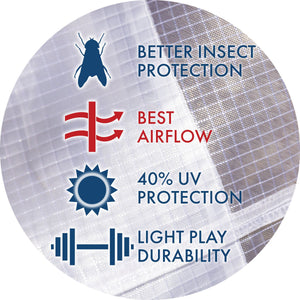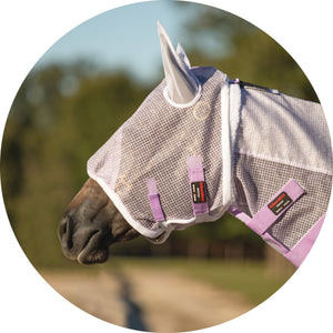 This pony mask is constructed from a textured, comfortable 300D nylon mesh material that provides the best airflow. When your pony is wearing this mask, they will be protected from small gnats, midges, and medium-sized flies, such as stable and deer flies. The 40% UV protection rating protects them from the harsh sun when they play in the pasture.