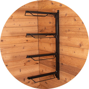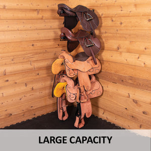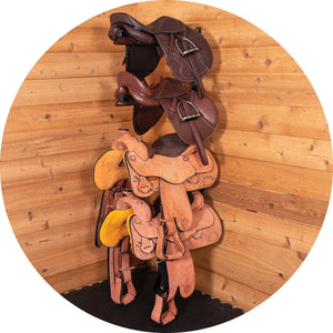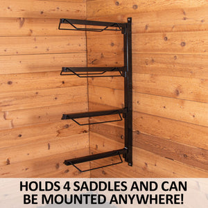 Keep your saddles well organized with this 4-saddle mounted rack. Mounts easily to a wall. 58" H X 10.5" W X 25" D. Saddle racks are 23.5"D