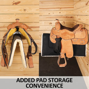 The pad arm, measuring 22 inches in length and situated beneath the saddle, offers additional space for saddle pads and various riding accessories, aiding your organization and efficiency.