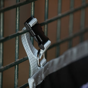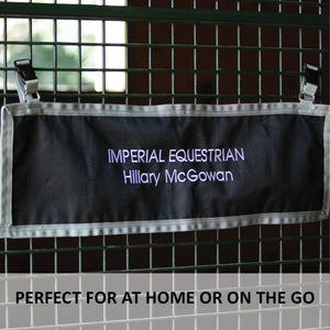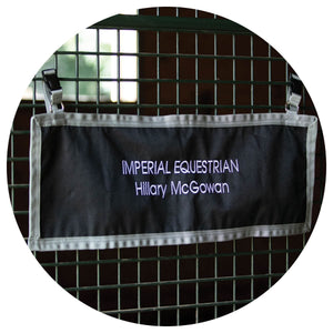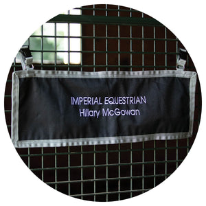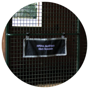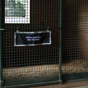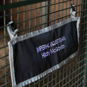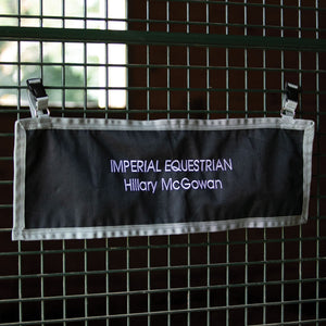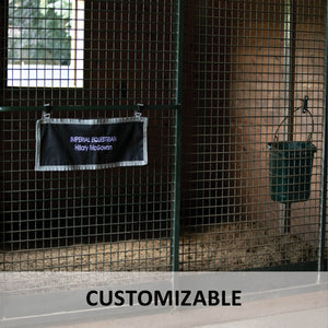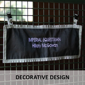 CThis Stall Front Name Banner adds a professional look to your stalls and is convenient to purchase! Made of durable 600D woven polyester, this banner can be easily customized with embroidered barn or horse names. It's perfect for individual stall doors at home and portable for shows! The decorative grey trim design stands out on your horse's door. The banner attaches easily with a buckle and adjustable webbing on top, which goes around the stall bars. Measures 30"L X 10"W.