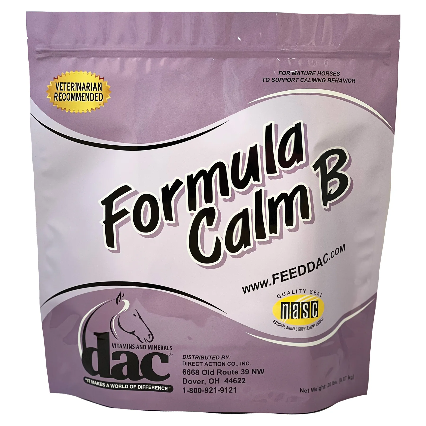- Feeding Directions: dac® Formula Calm B can be fed with either fortified or unfortified grains. Fortified grains contain added vitamins and minerals. Feed dac® Formula Calm B at the following rates: Feed one scoop (1 ounce) per horse per day. Feeding rate based on 1000 lb horse.