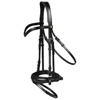 Snaffle Dressage Bridles with flash components are the most common kind of bridle used for dressage. Dressage Bridles are traditionally black and have a flash to keep the horse from opening their mouth to ignore hand aids. Though flash bridles are the most commonly used, many upper level dressage riders also use double bridles to further enhance their hand to mouth communication.