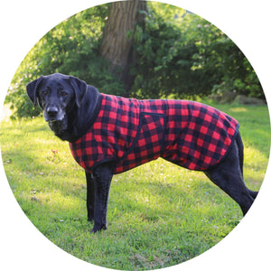 Super soft and cozy 260 gm Buffalo Red Plaid Fleece with fleece collar pulls over the head and wraps around each side, attaching with hook and loop closures. Great for adding a warmth layer under a blanket, drying after a bath or just a warming layer for inside.