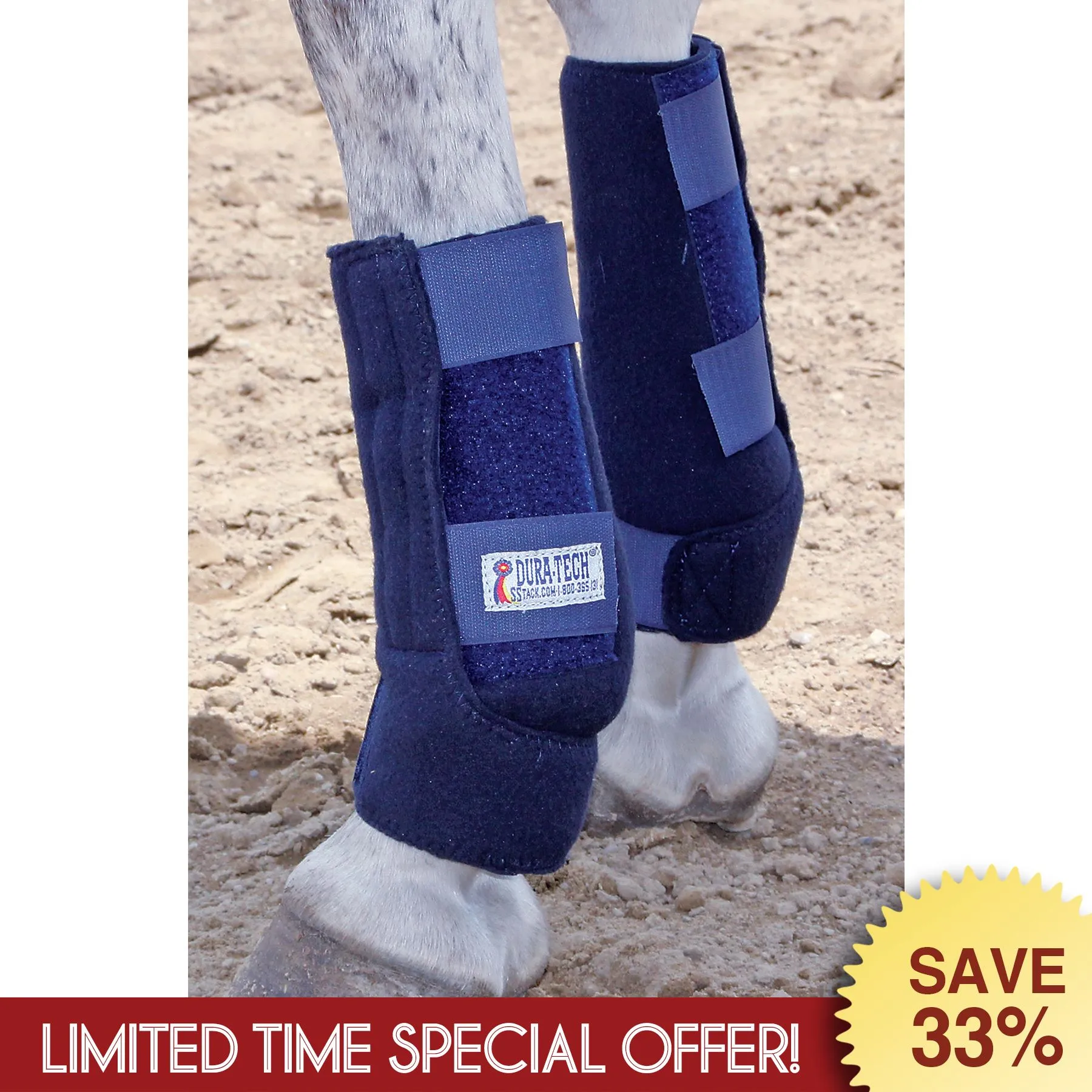 These fast wrap polos provide moderate protection and ensure safe and proper application every time with their one piece construction, generous padding and suspensory support. These polos are contoured to conform to the leg, protecting soft tissue from impact as well as protecting the cannon bone and sesamoids. The suspensory strap wraps under the fetlock to add addition support and take the guess work out of correct placement. These one piece, wrap around polos are constructed of dense, 360 gram anti-pill fleece and are secured with two heavy duty hook & loop straps.
