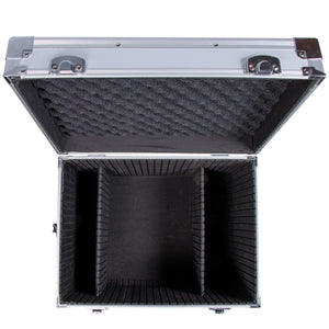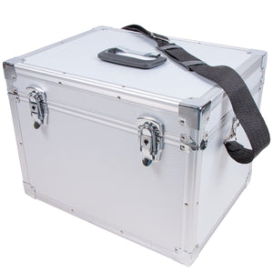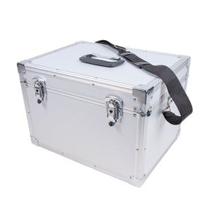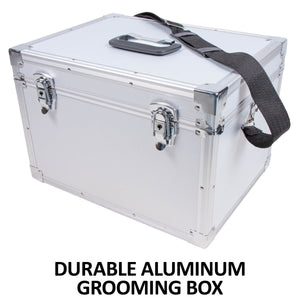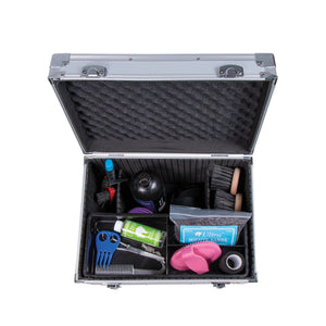 This locking, aluminum horse grooming box is designed to be durable and functional. Crafted from sturdy aluminum, it features a lockable lid and a padded interior to protect your grooming tools. It is designed for easy transport, equipped with a carry handle and strap.