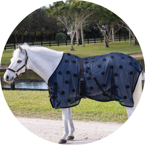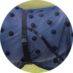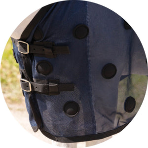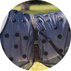 The mesh pony sheet features over 90 strategically positioned unipolar magnets for effective therapeutic penetration. Each magnet measures 570 GAUS, providing low to medium penetration. Each magnet is enclosed in a neoprene pocket for stability and even distribution. This therapy sheet is designed with your pony's comfort and recovery in mind. It is made with lightweight 350D mesh material and an open-front design.