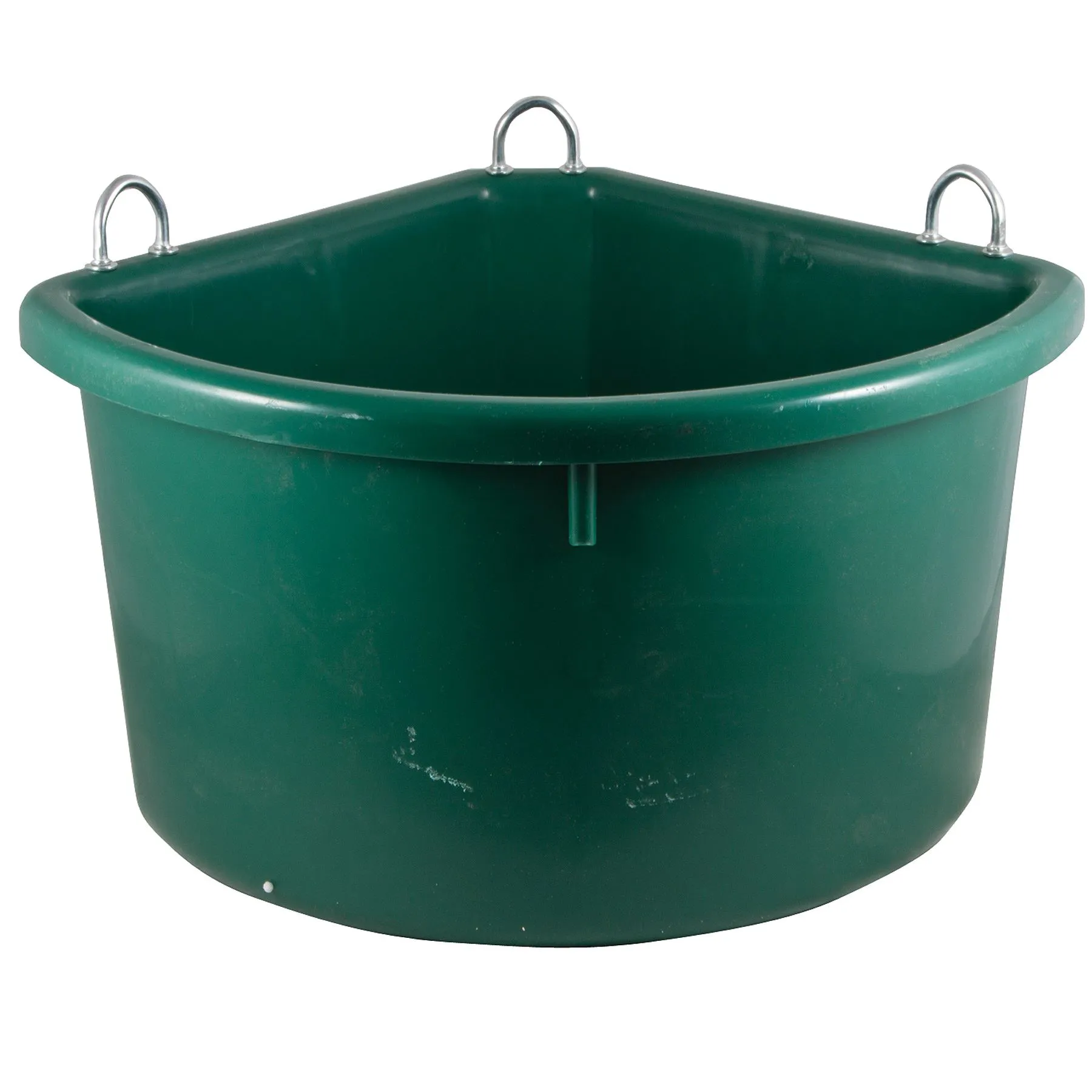 This 30-quart corner feeder is the ultimate feeding sidekick for horse owners! This hardy feeder, engineered by experienced horsemen, is built to outlast the rest. Made from thick-walled, high-impact plastic that's 100% chemical-free, it laughs in the face of tough conditions. Not only is it tough, but it also fits snugly into corners, saving valuable space in your stable. With reinforced U-bolts, you can fasten this sturdy feeder securely. Worried about messy grain slinging? Don't be! Its deep design and roomy 30-quart capacity guarantee that the grain stays where it should - in the feeder.