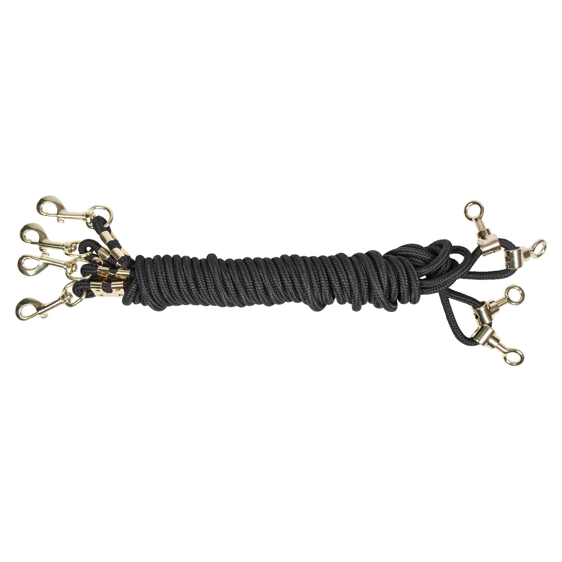 Instructions for use: Unravel the rope from the package. Use the first rope on the first diagonal across the top of the stall and clip snaps back to the adjustable slide hardware. Move slide hardware appropriately along the rope to ensure it's tight. Use the second rope and do the same to the other diagonal across the top of the stall. Begin installation of the nylon panel using zip ties through grommets and around the top of the stall bar.