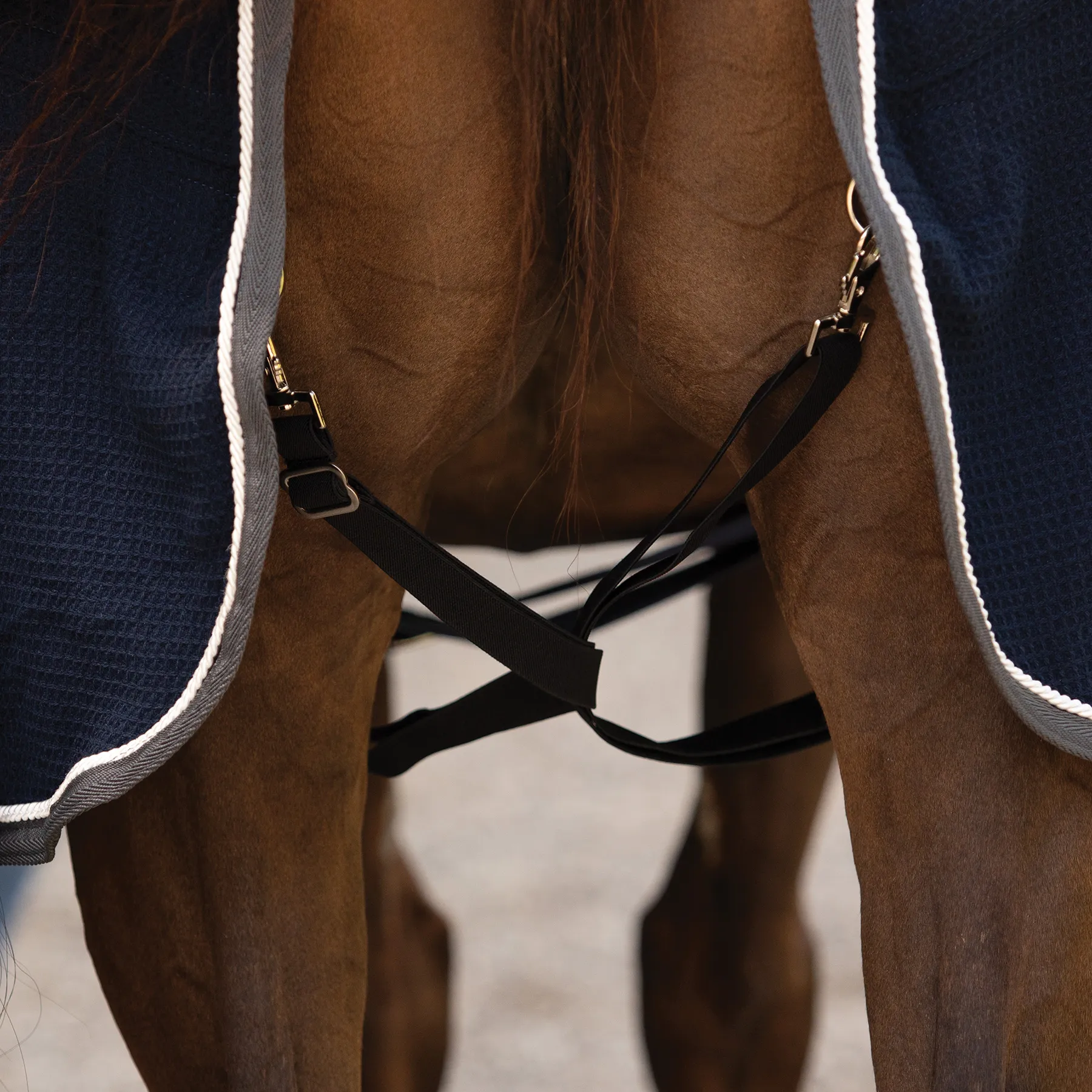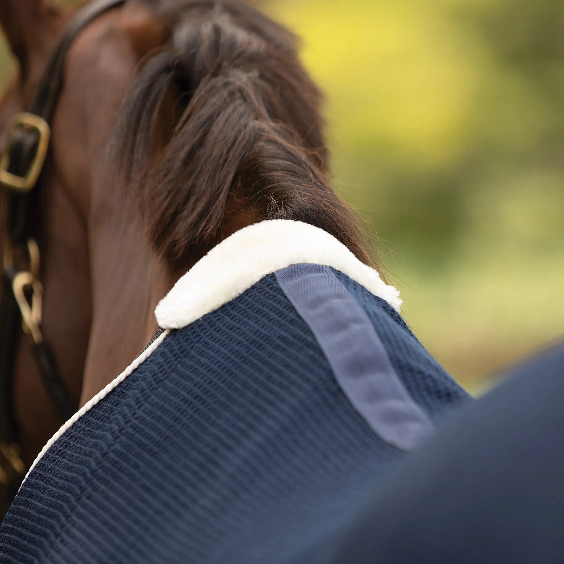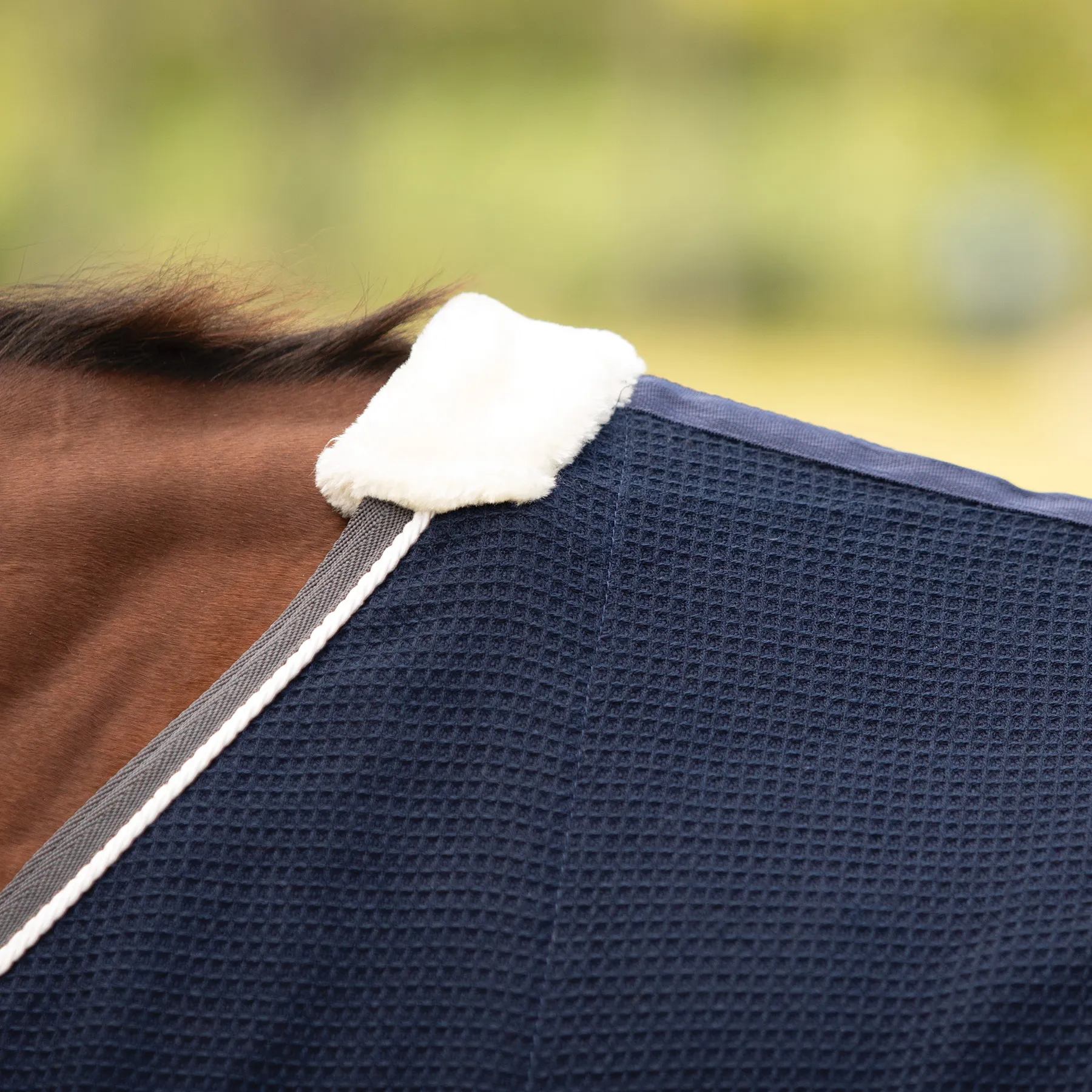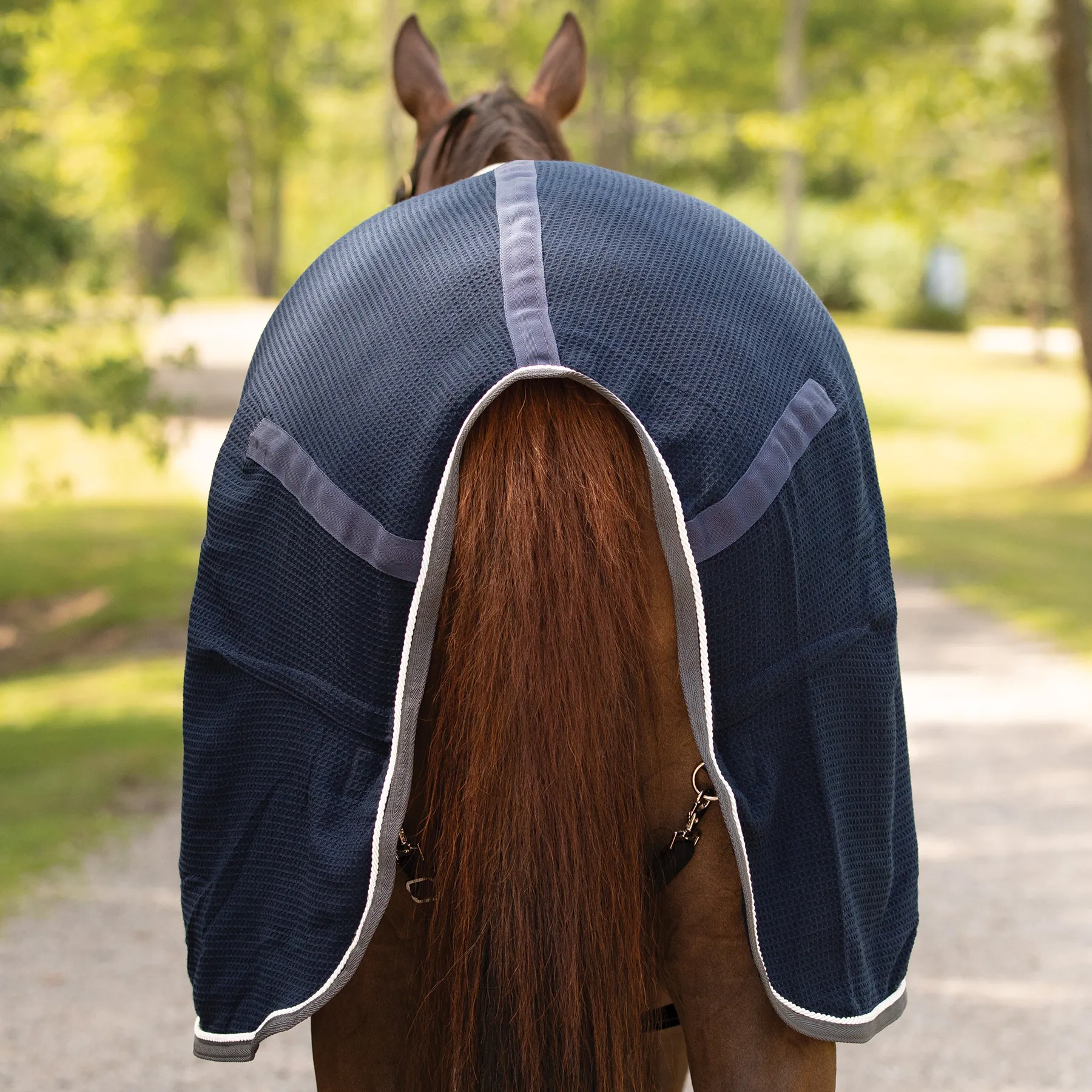 Experience the difference with this temp tamer cotton anti-sweat sheet. This versatile sheet is made from 100% cotton waffle weave, complete with nylon-lined shoulders, perfect for use as a liner under turnouts, a trailering sheet, or a cooling sheet. The material is designed to combat static build-up during dry months, ensuring your horse's comfort all year round.