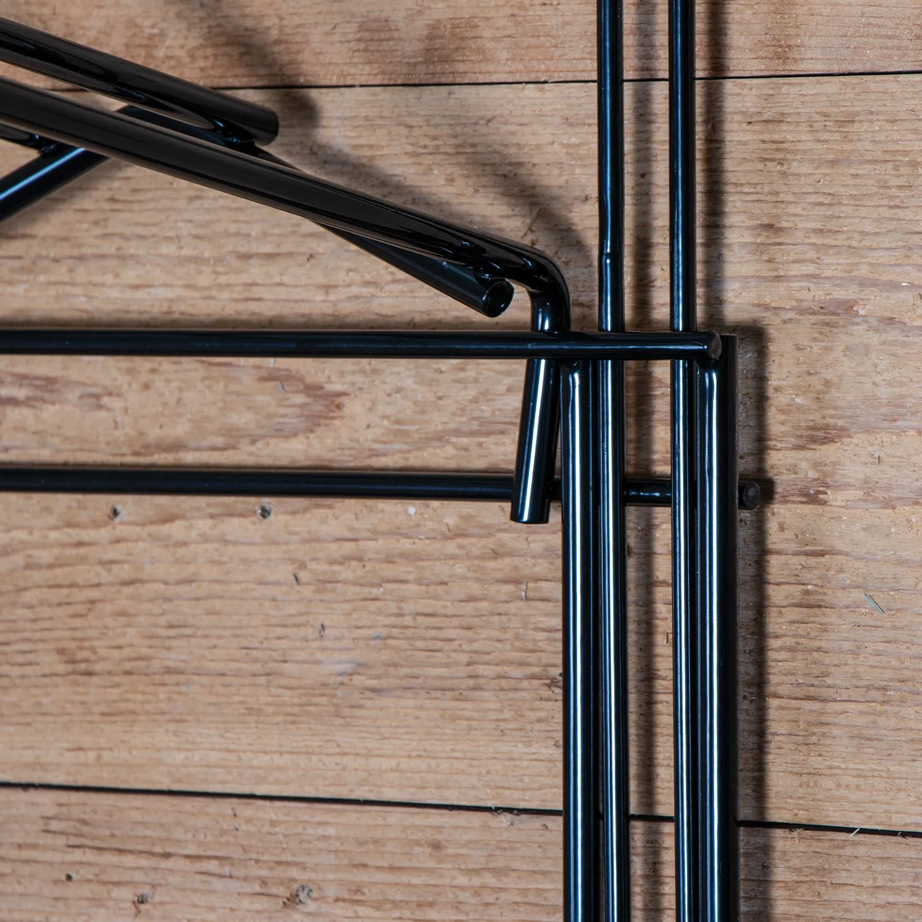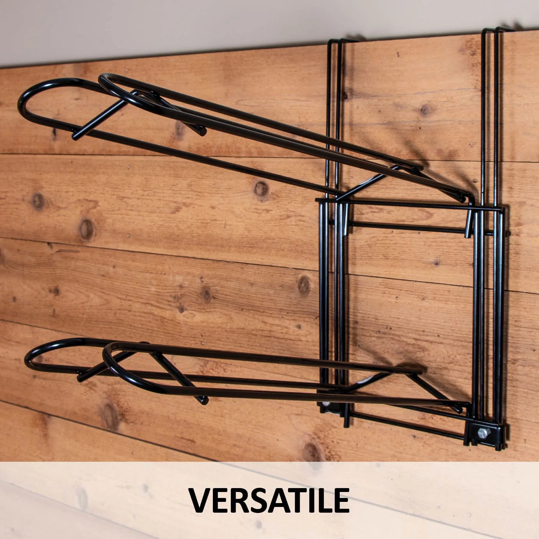 This main frame is 2 tier capable and compatible with our saddle racks, wire baskets, and mini swing arm racks. The smaller 2 tier design is the perfect choice for the single horse owner and less tack. It can be used on front of stalls or on tall walls (hangers are adjustable down to 10" H above frame.