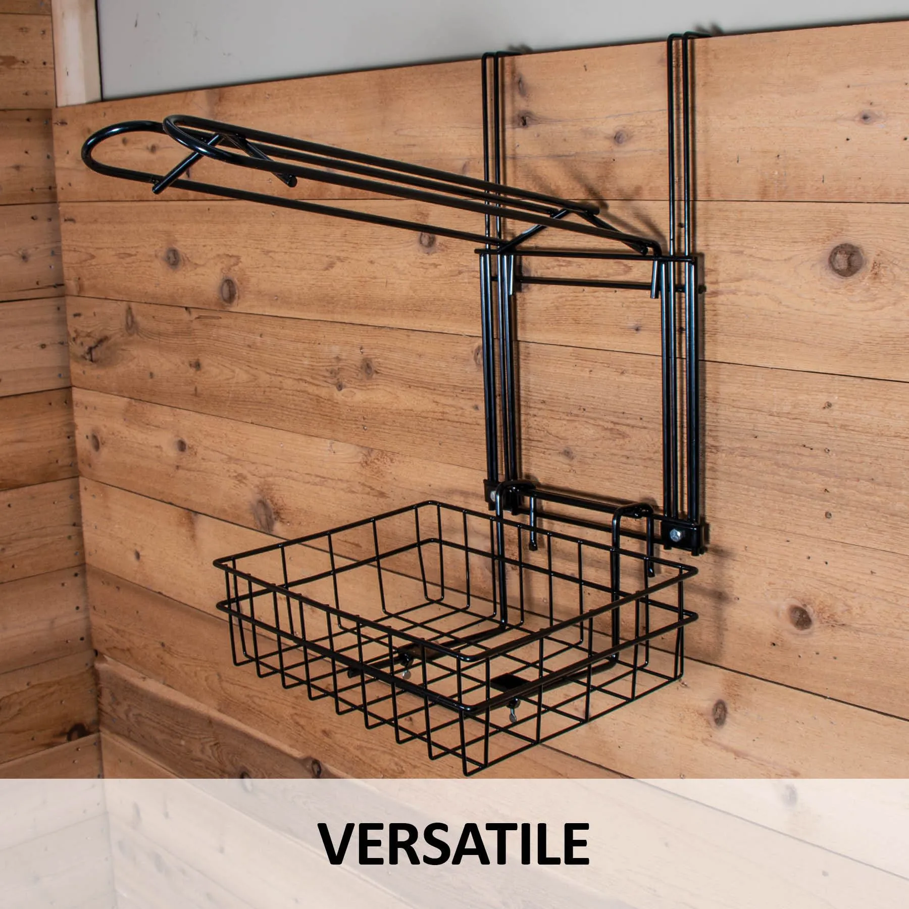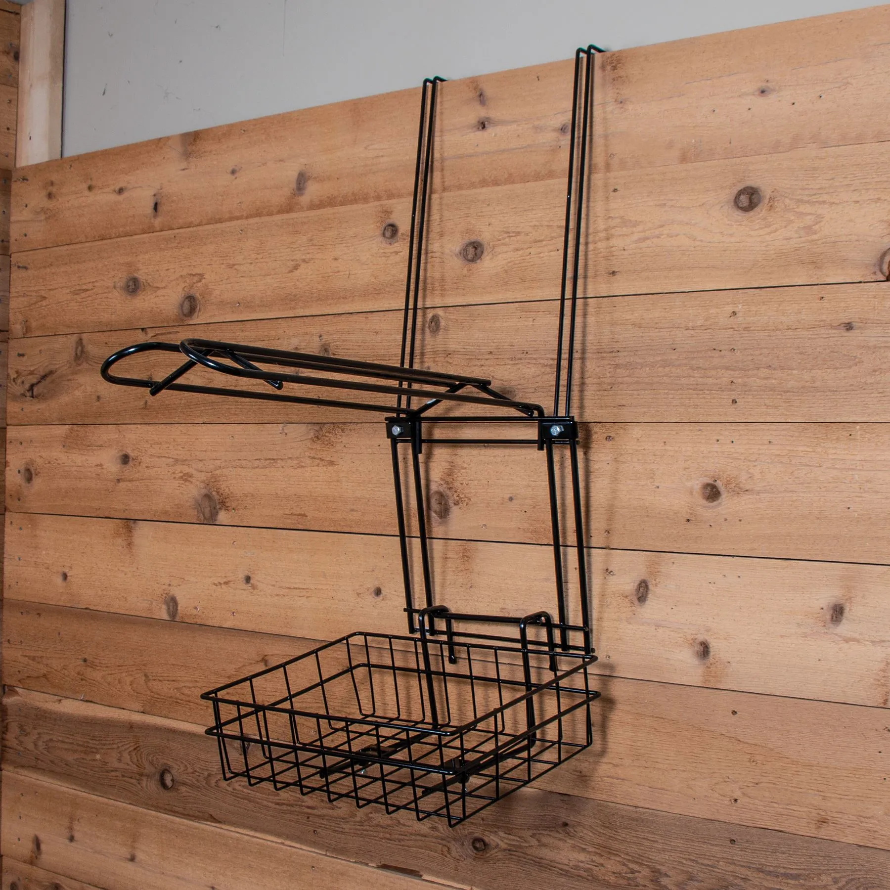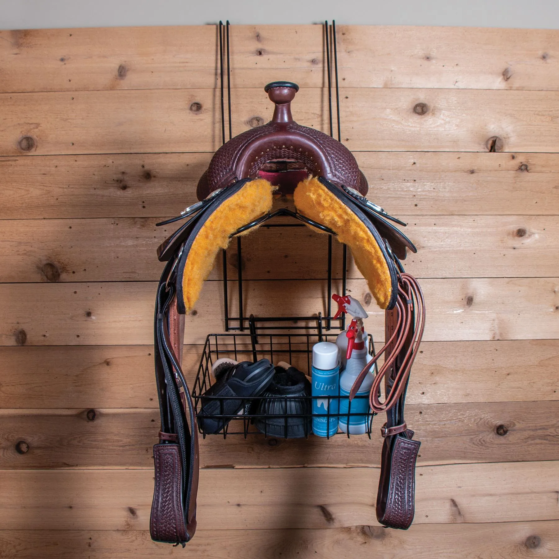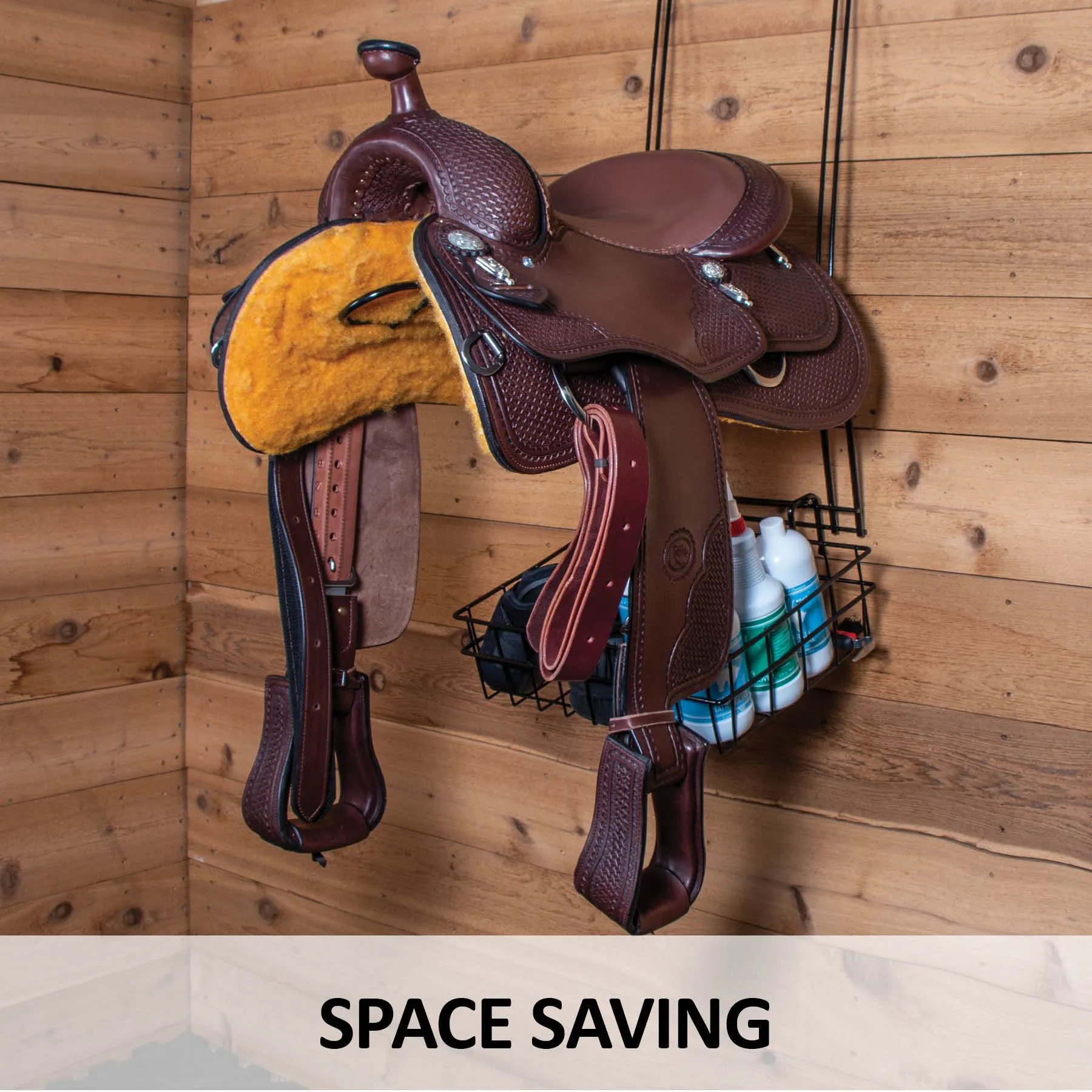 This main frame is 2 tier capable and compatible with our saddle racks, wire baskets, and mini swing arm racks. The smaller 2 tier design is the perfect choice for the single horse owner and less tack. It can be used on front of stalls or on tall walls (hangers are adjustable down to 10" H above frame.