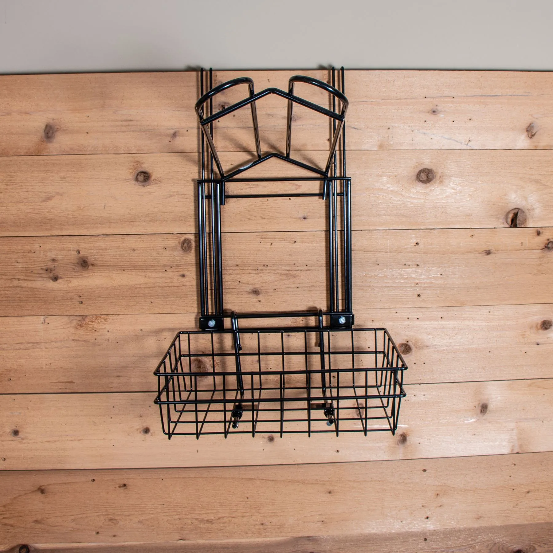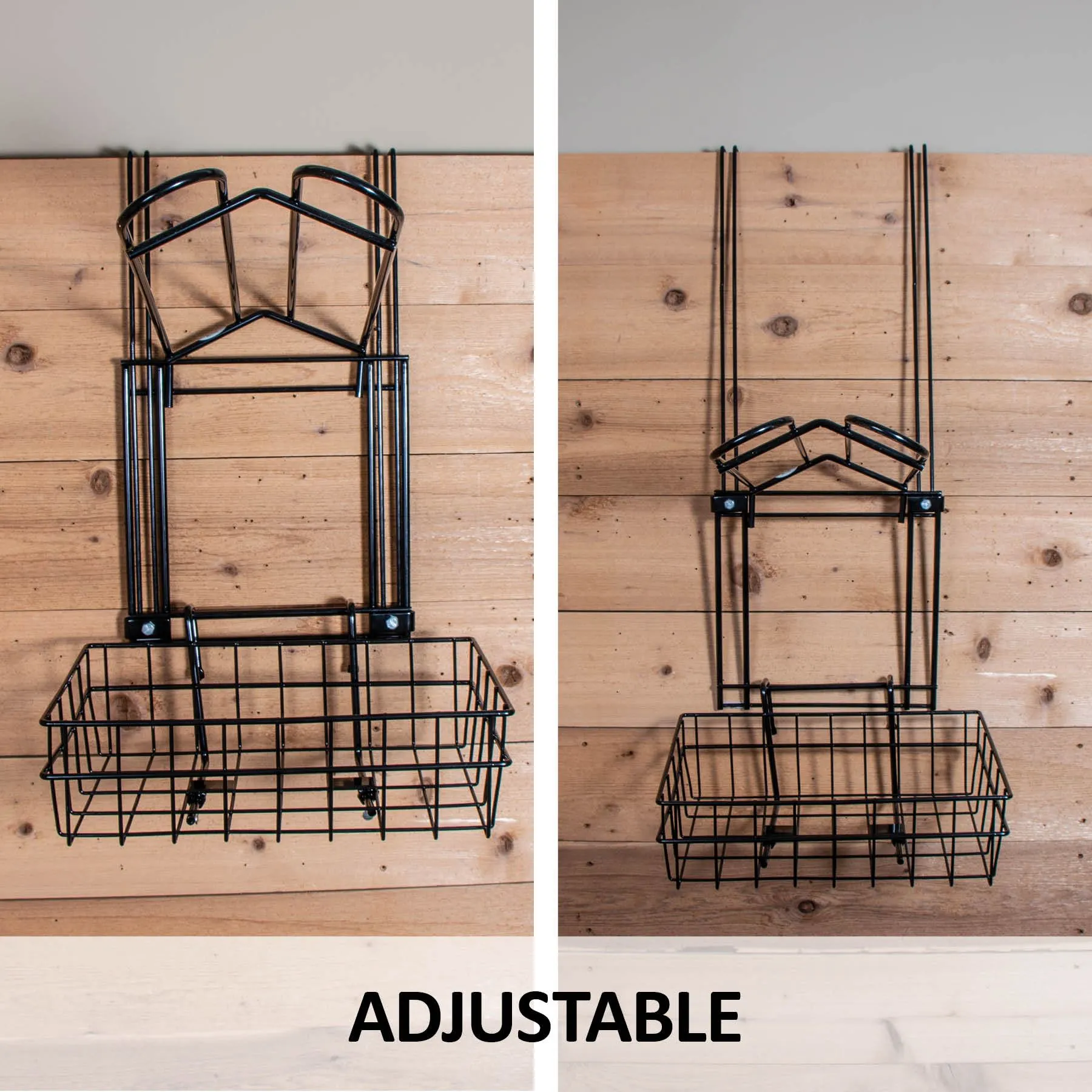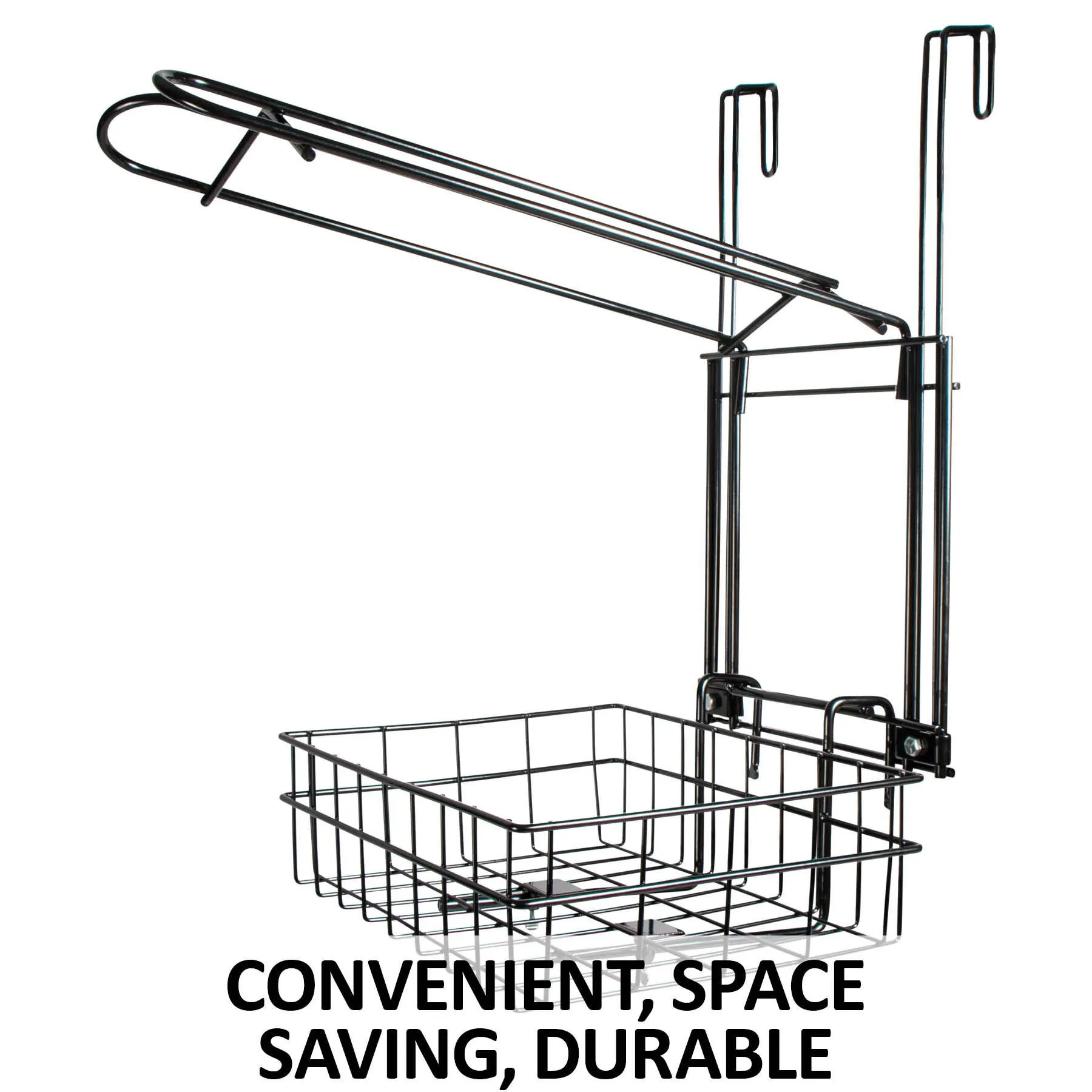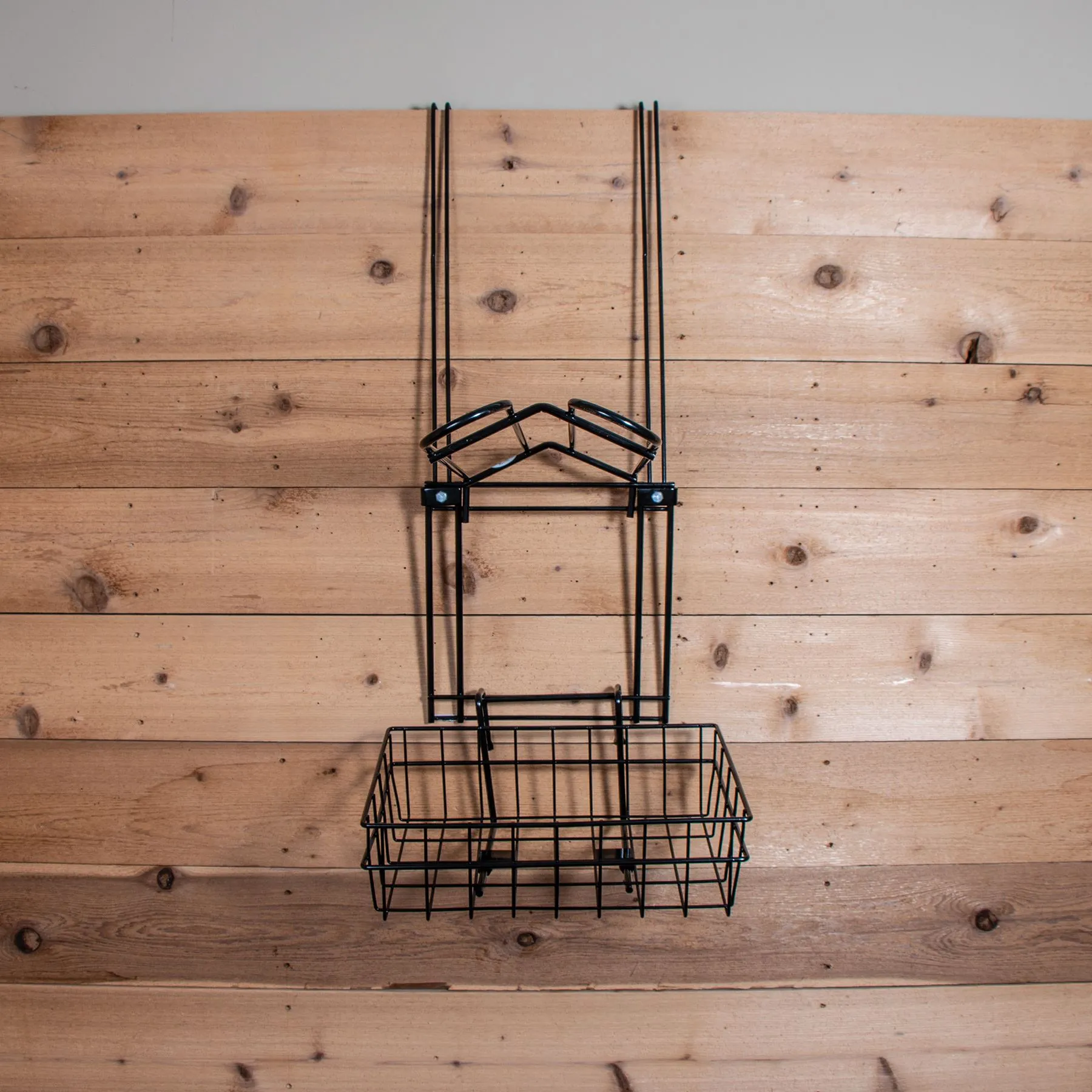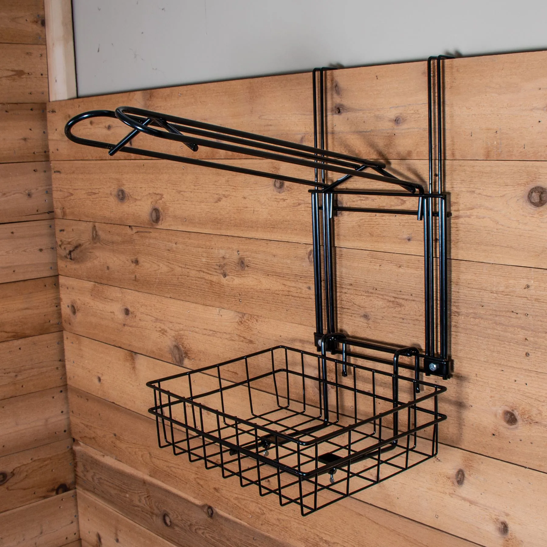 This main frame is 2 tier capable and compatible with our saddle racks, wire baskets, and mini swing arm racks. The smaller 2 tier design is the perfect choice for the single horse owner and less tack. It can be used on front of stalls or on tall walls (hangers are adjustable down to 10" H above frame.