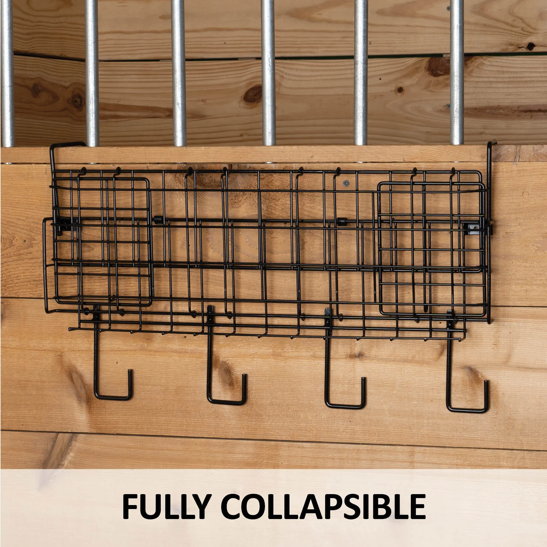 This collapsible basket and tack rack offers ample space to neatly arrange and showcase your bridles, reins, and other must-have riding gear. Its robust yet foldable construction combines convenience with durability, with four swivel hooks to hang up your tack.