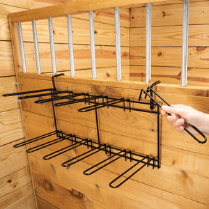 The Easy-Up® Portable 12-Horse Boot Rack will hold all styles of horse boots when you're on the go! This portable horse boot rack is excellent for storing and drying used horse boots like open-front boots, sports medicine boots, bell boots, splint boots, and more after workouts or washing. Each rack is designed at a 95-degree angle to prevent any boots from slipping off. Rather than tossing your horse boots in a pile on the floor, you can keep them organized and able to air-dry between use or after washing, whether you're at home or horse shows.