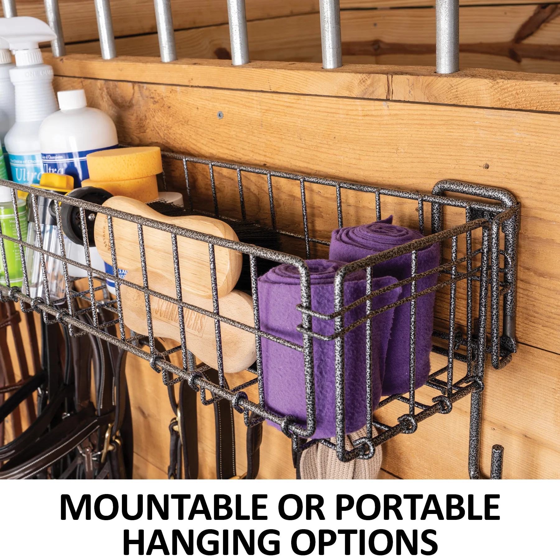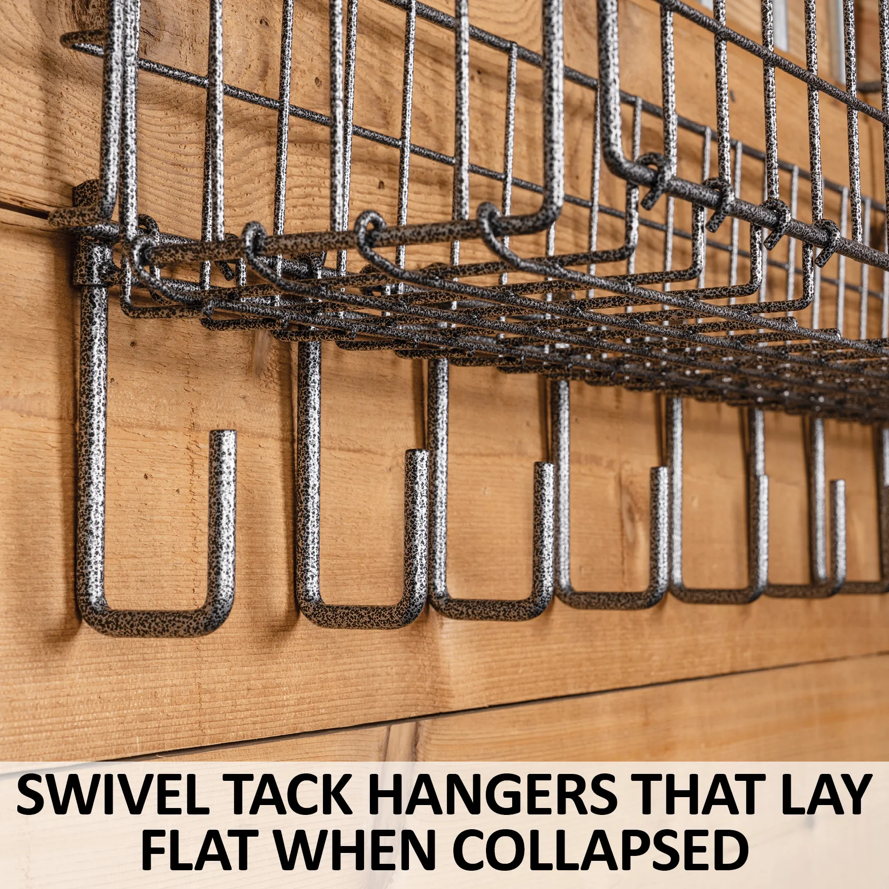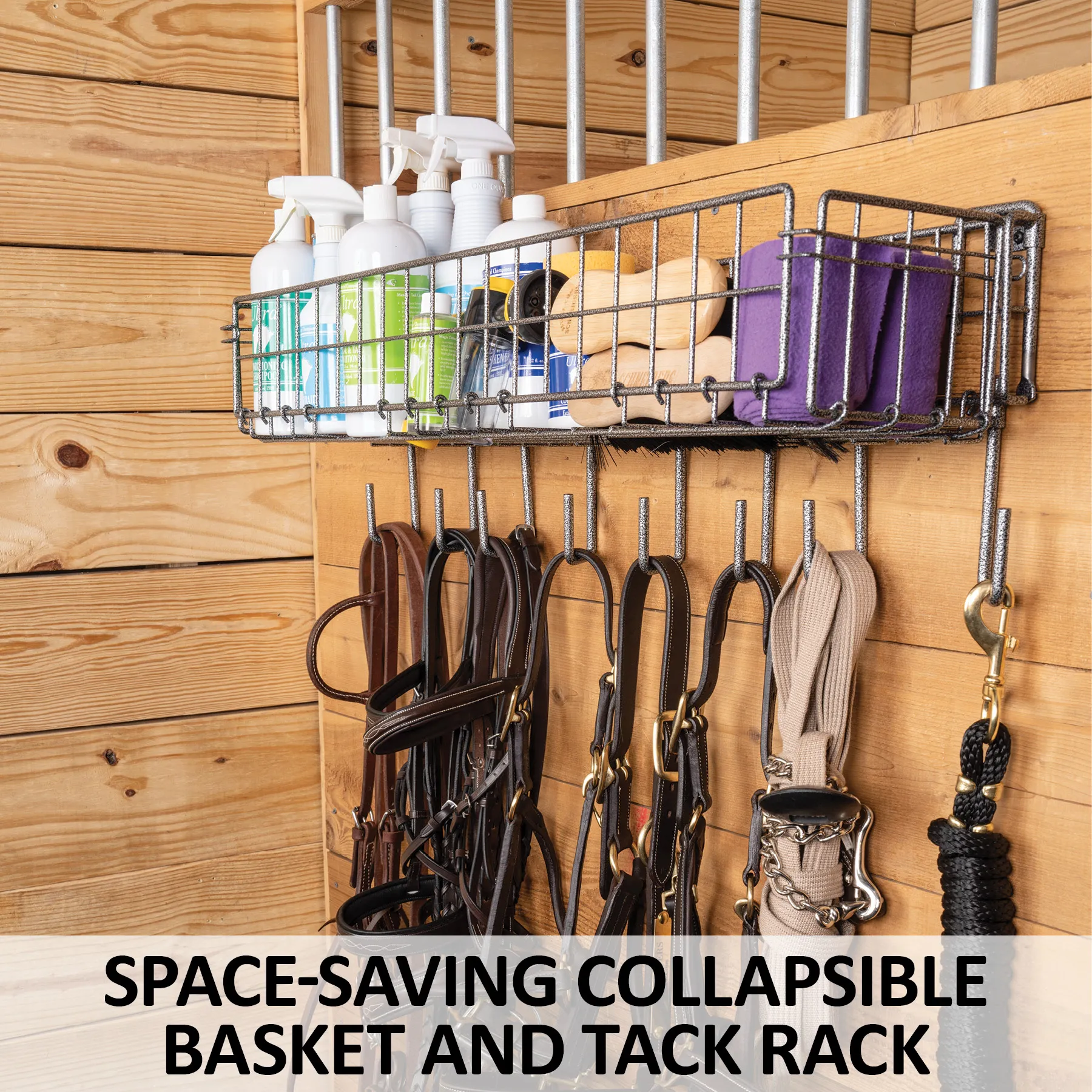 This collapsible basket and tack rack is a space-saving design that is perfect for use during travel or in the barn. Use the collapsible basket to hold your bulkier items and grooming supplies. The eight hooks on the bottom are great for your tack items. Plus, the hooks swivel over for safety if anything were to graze past them.