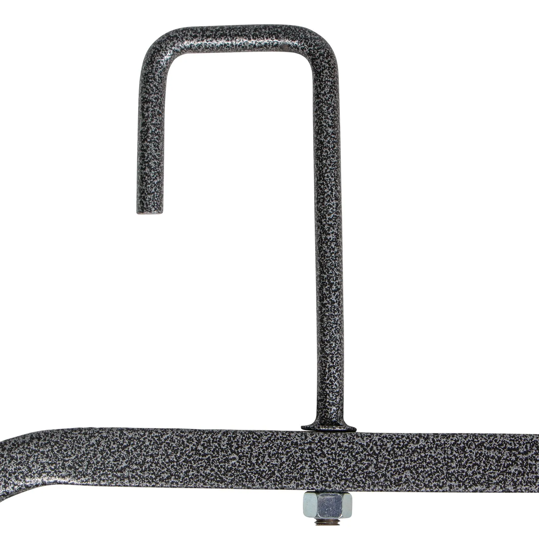 This heavy-duty 1" carbon steel hook over saddle rack is designed to fit any width space between stall bars. It can be easily hung over your stall's front, and the hook and saddle rack are removable for convenient teardown and storage. The hook design allows placement over the front of your stalls or on stall walls between separated oak boards at mid-height, ensuring easy access to your saddle rack. It can securely hold even the heaviest Western saddles and is also shaped correctly for English saddles. This item also includes drilled holes for optional mounting against a wall, making it a versatile choice.