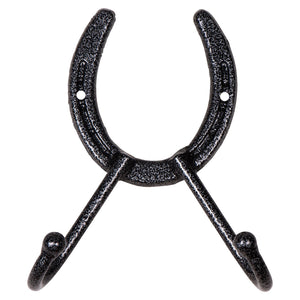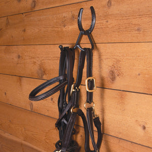 This horseshoe double tack hook is the ultimate space-saving solution that brings organization and style to your barn. This tack hook is crafted with horse owners in mind, offering a secure spot for all your equine gear, adding rustic elegance to your stable. Imagine your barn becoming a tidy, welcoming space where every piece of tack has its place, from bridles to whips.