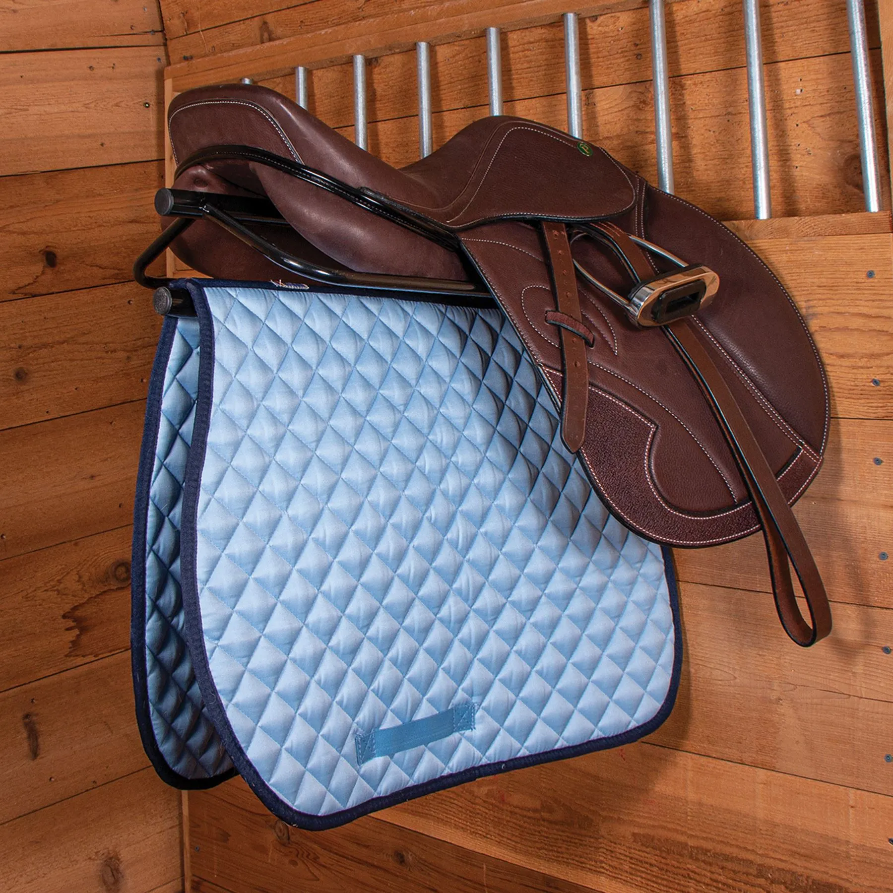 Our customer-favorite saddle rack with pad bar comes in vinyl-coated steel and holds your saddle while allowing your pad to air out and dry without touching your saddle. This heavy-duty rack is made to hold both Western and English saddles of all shapes and sizes. Mount this rack with single or double pad rack options, or purchase the portable version with a single pad rack.