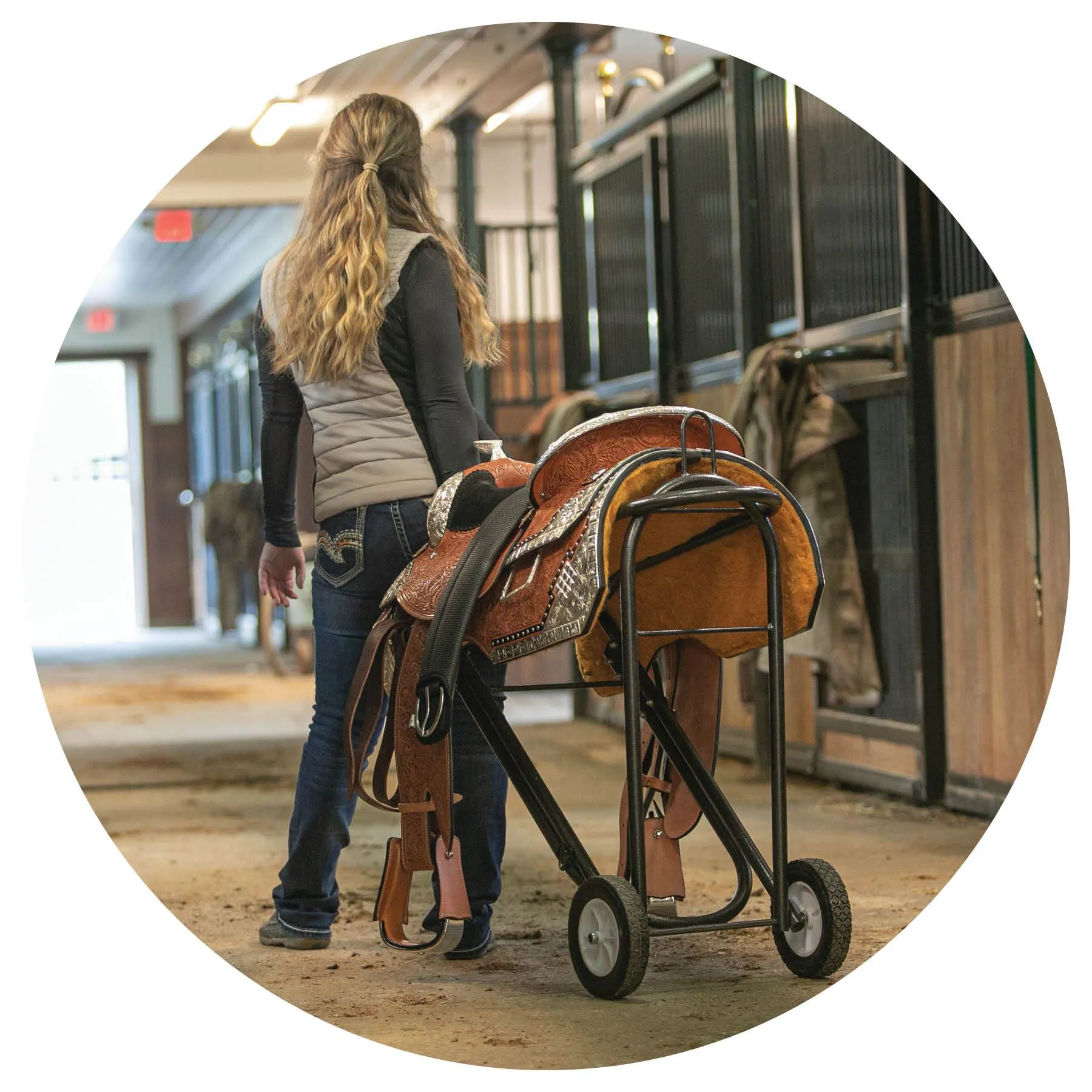 This heavy-duty saddle rack makes transporting your saddle around the barn or between the trailer and stalls at shows easy. Made from galvanized steel tubing with hard rubber wheels, this saddle cart offers strength and mobility, ensuring a secure and organized space for your English or Western saddles. When not in use, this cart folds flat for compact storage. Note: Western saddles should be positioned with the cantle end against the front metal U joint for proper alignment.